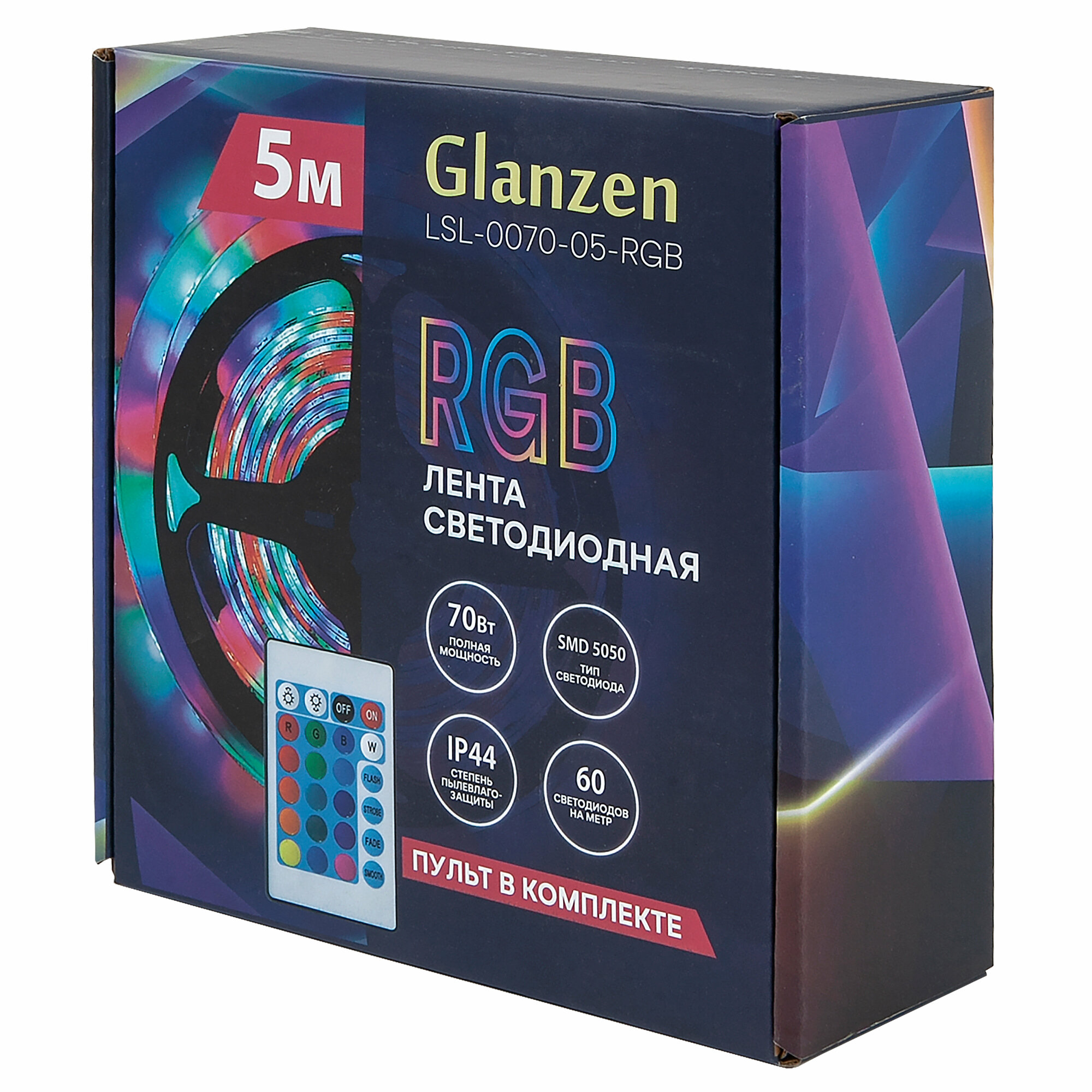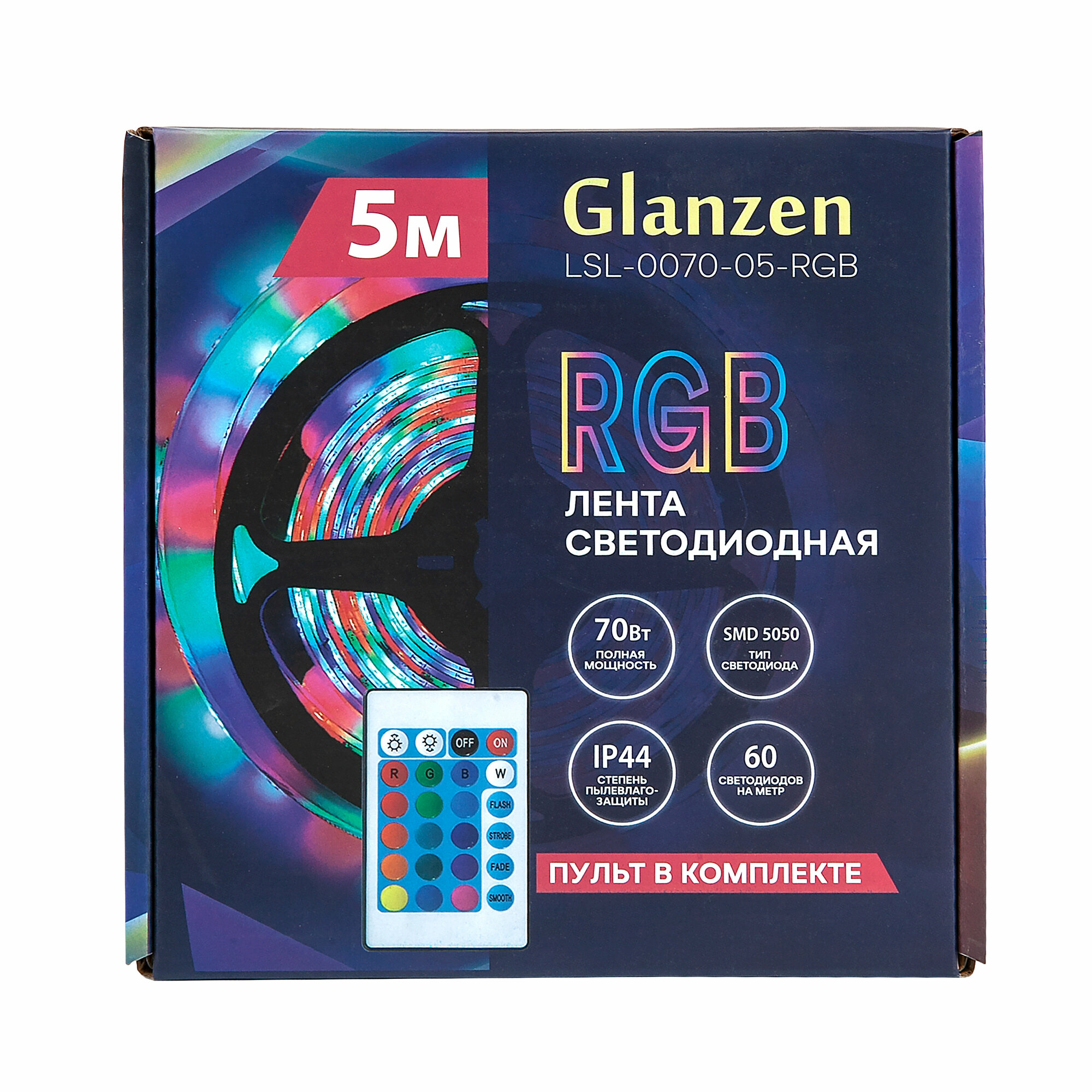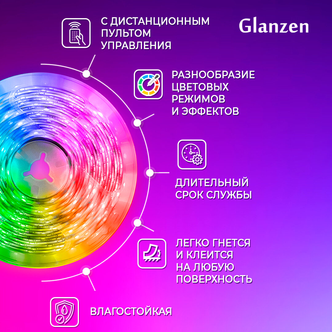 Светодиодная RGB лента-гирлянда led подсветка 5 м 70 Вт GLANZEN LSL-0070-05-RGB SMD 5050 с пультом управления