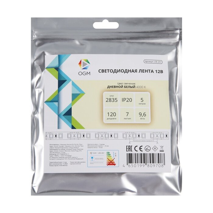Светодиодная лента OGM LSE-257 с напряжением 12В, цвет свечения дневной белый 4000К, 120д/м, 9,6Вт/м, smd2835, IP20, 7Лм/чип, длина 5 м.