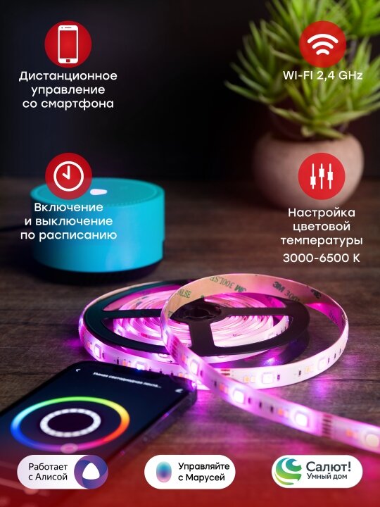 | Комплектация | светодиодная лента на клейкой основе, пульт управления, WI-FI контроллер, блок питания |