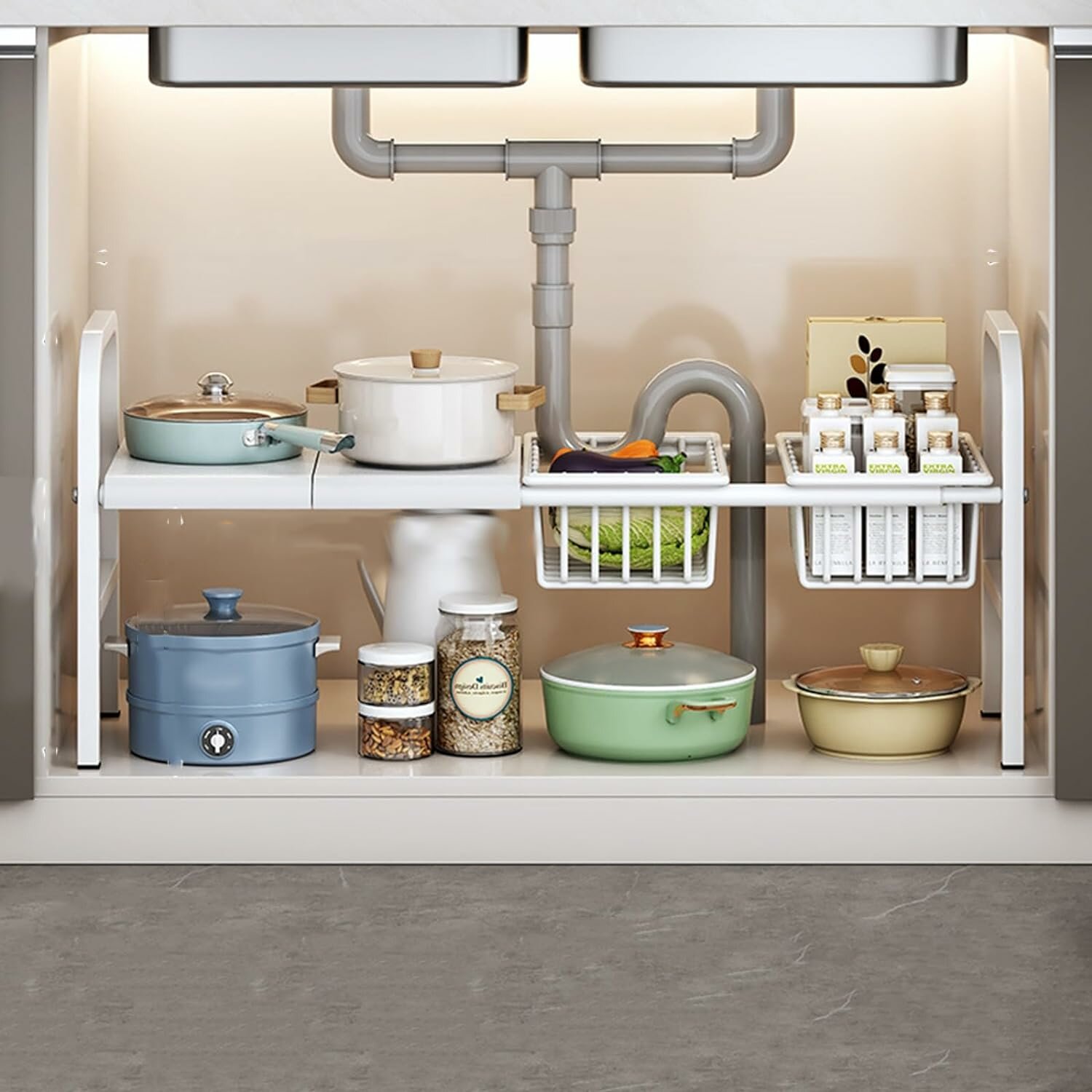 Ниже Вы можете прочитать отзывы на Органайзер под раковиной — выдвижная кухонная полка для хранения под раковиной одноярусная 2 полки 2 корзины, белая, ознакомится с подробными характеристиками, посмотреть интересные обзоры и фотографии на Органайзер под раковиной — выдвижная кухонная полка для хранения под раковиной одноярусная 2 полки 2 корзины, белая.