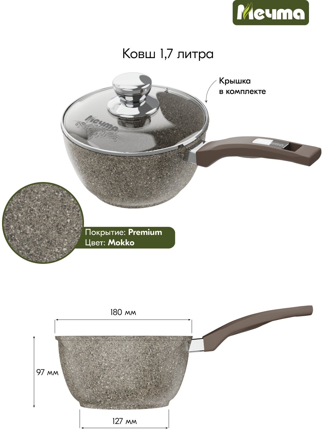 Ковш Мечта 1.7 л Премиум с антипригарным покрытием с несъемной ручкой и крышкой, НЕ индукционная