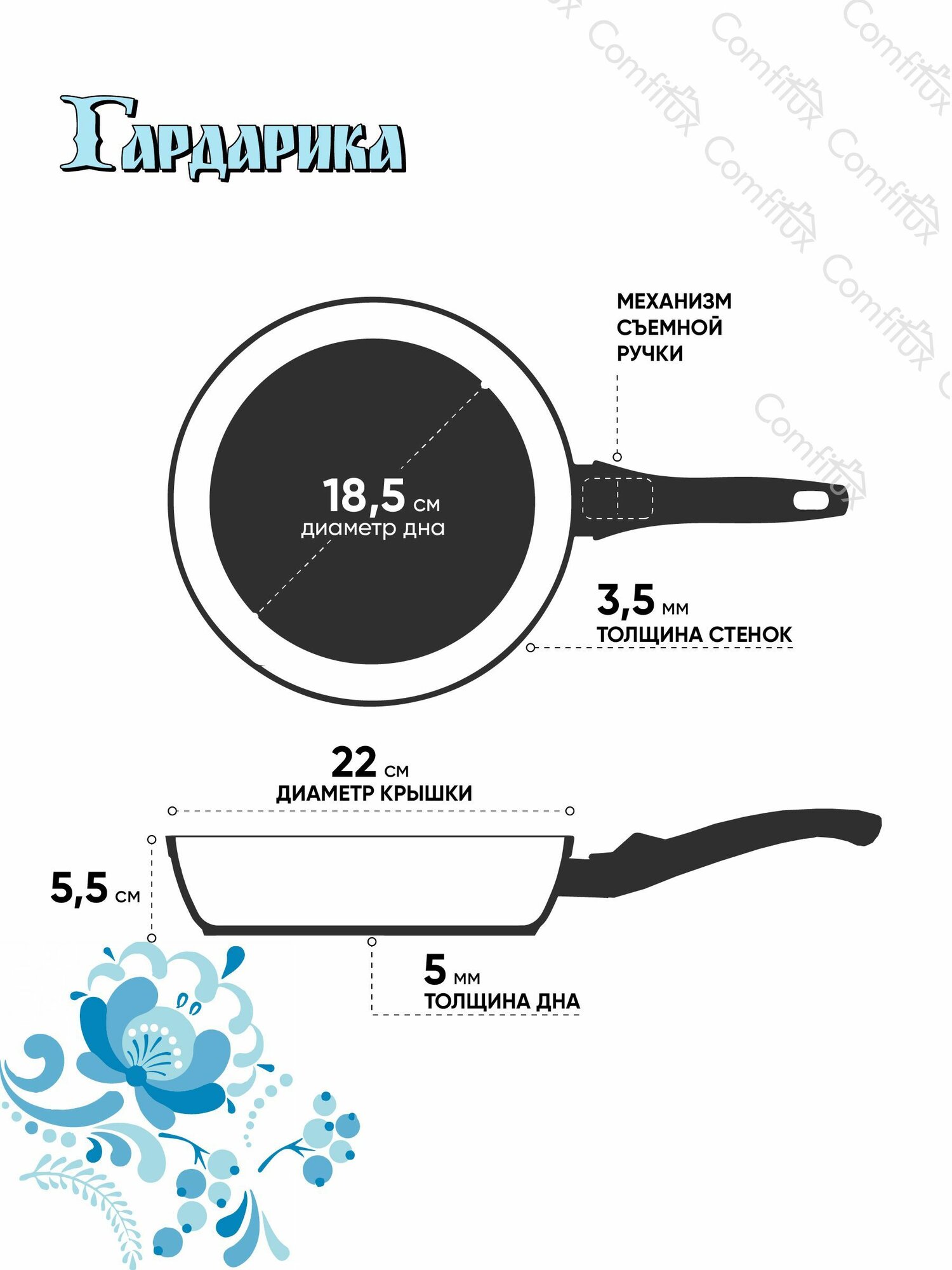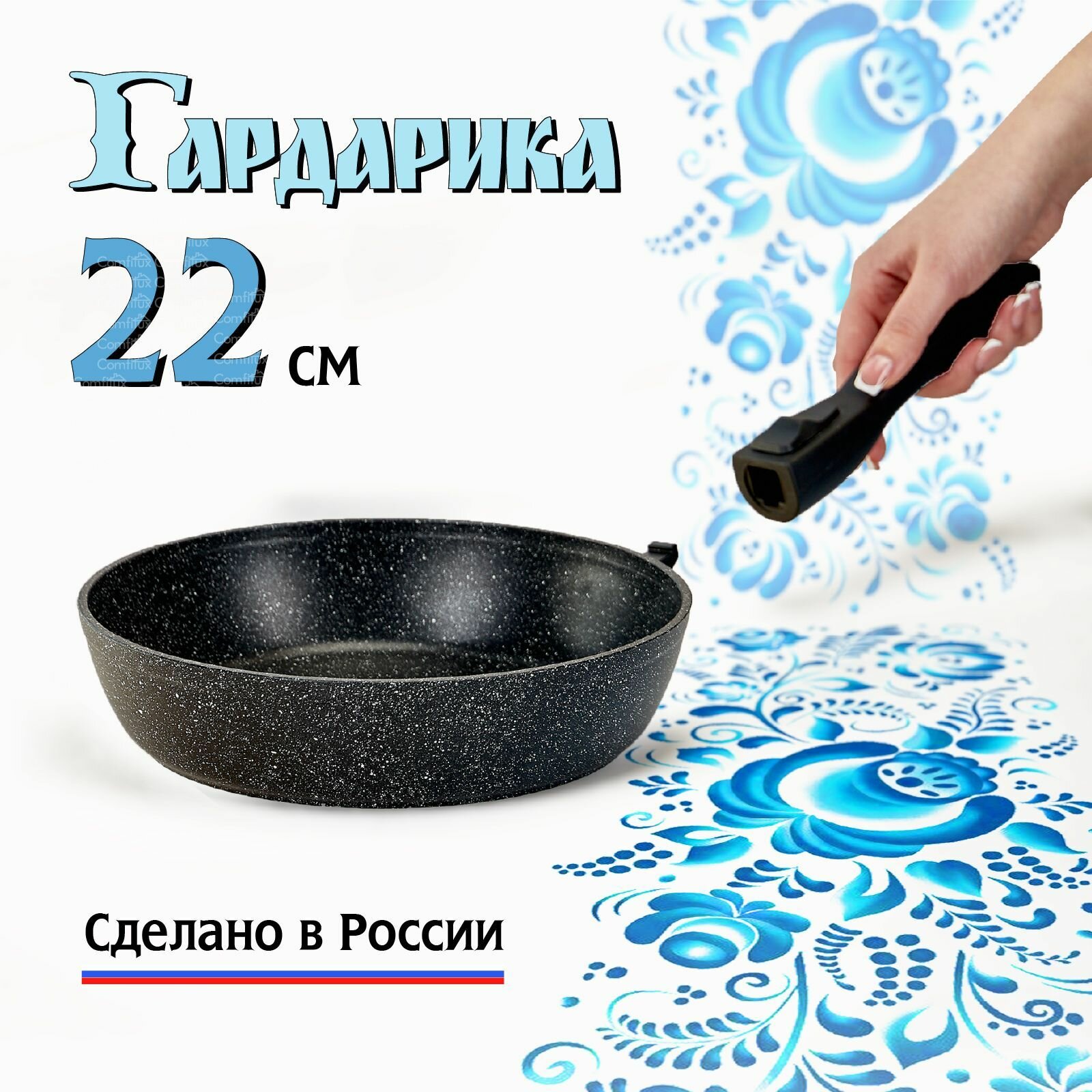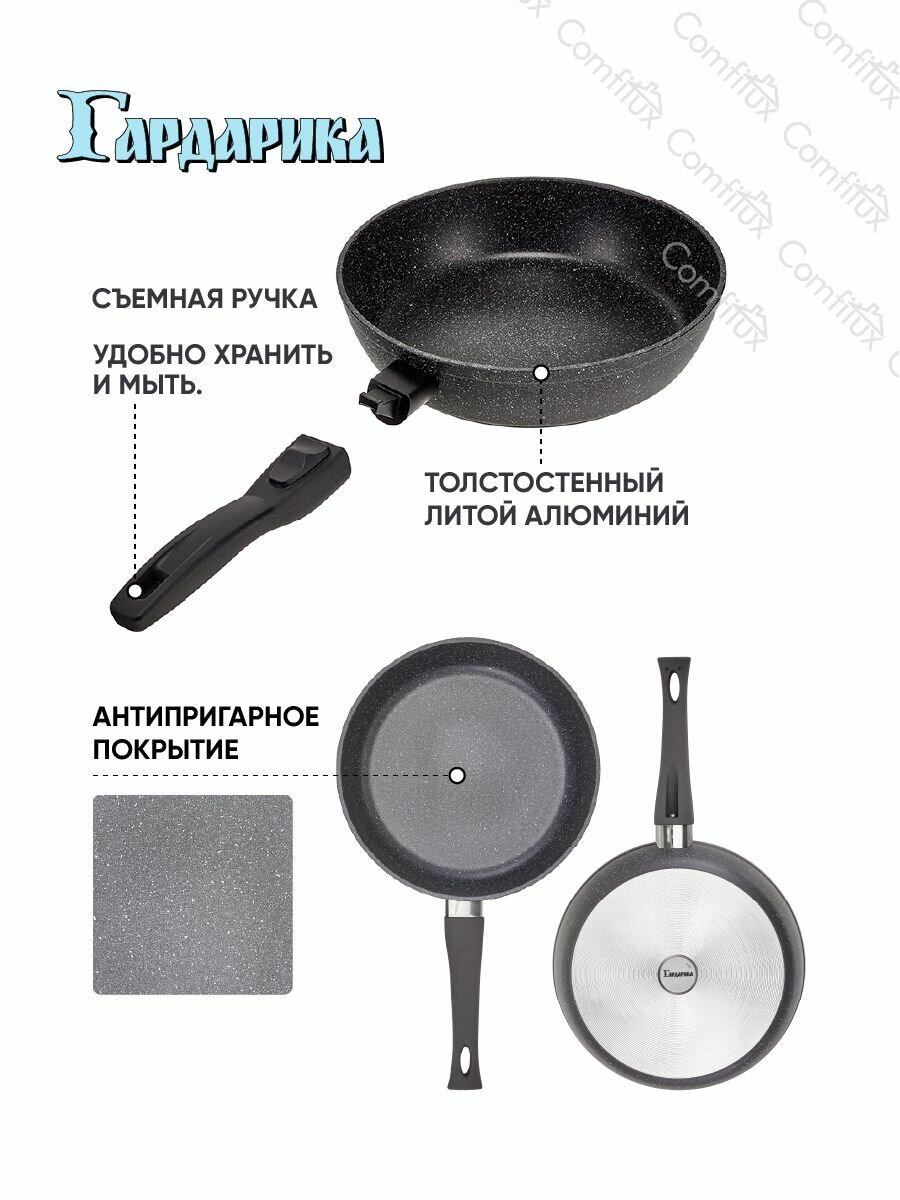 СохранитьСковорода со съемной ручкой 22 см литая с усиленным антипригарны покрытием, Гардарика Орион интересное: