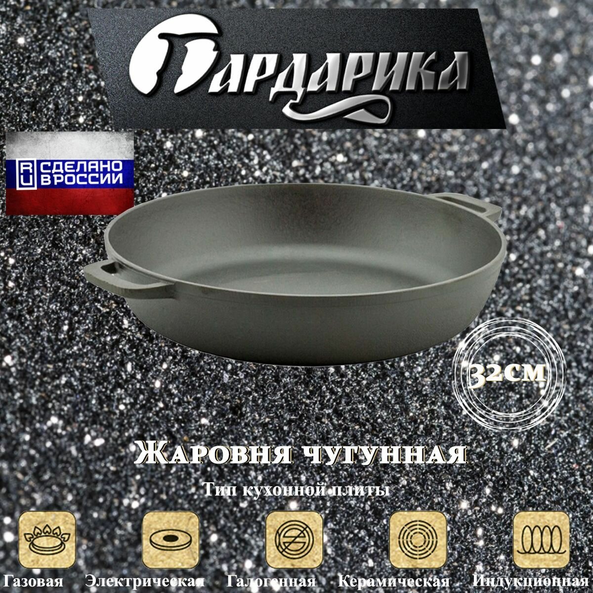 Жаровня чугунная гардарика с двумя ручками б/кр 32см 1832