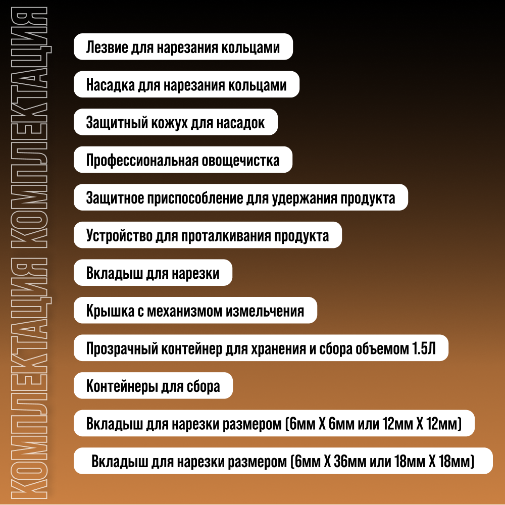 | Форма нарезки | брусочки / дольки / кубики / ломтики / соломка |