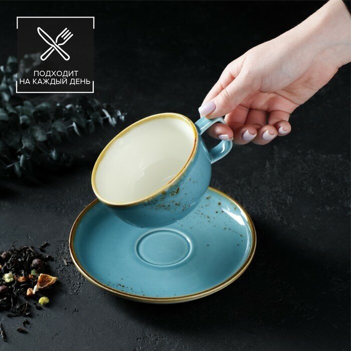 Чайная пара фарфоровая для сервировки стола, кружка с блюдцем для чая и кофе Magistro "Церера", 250 мл, цвет голубой