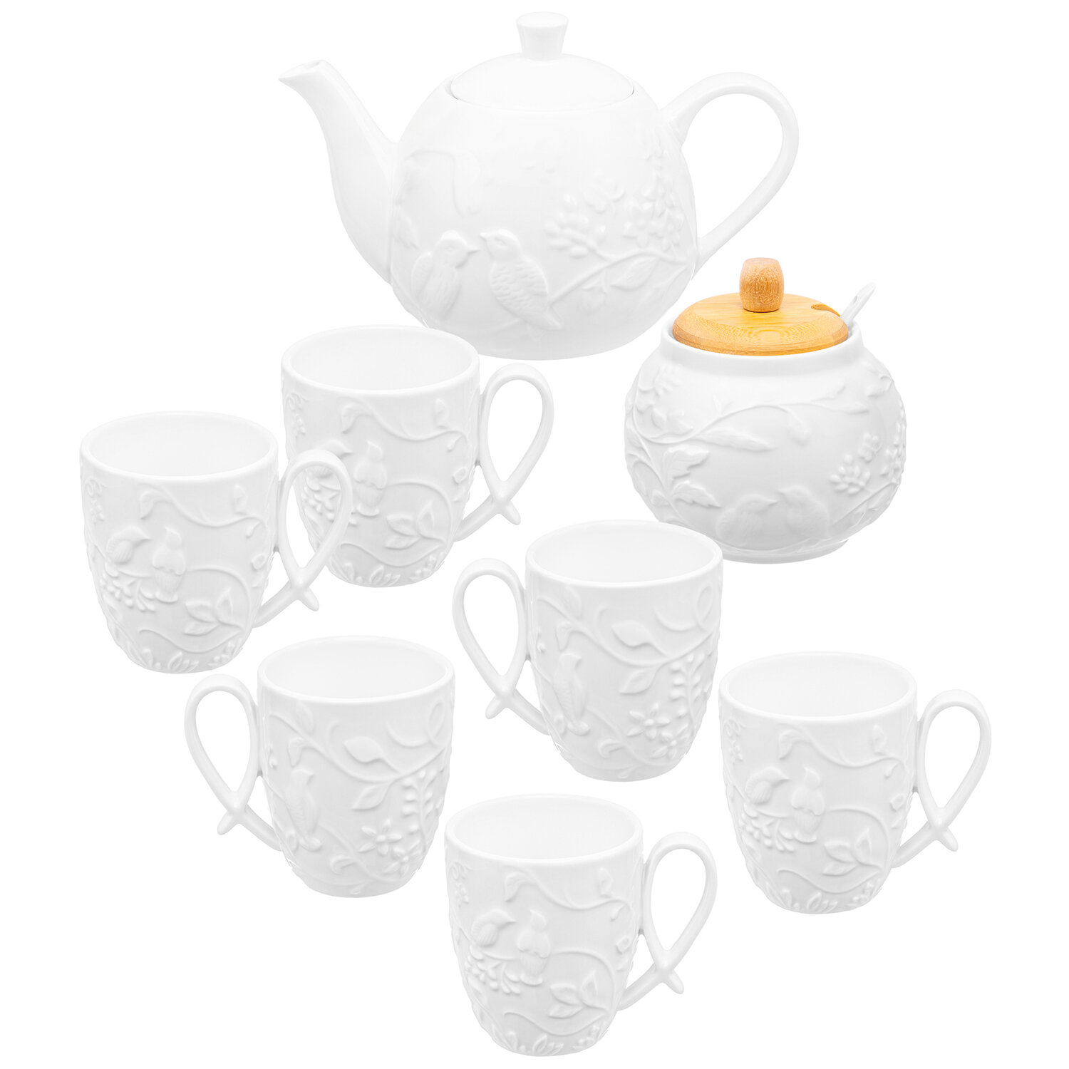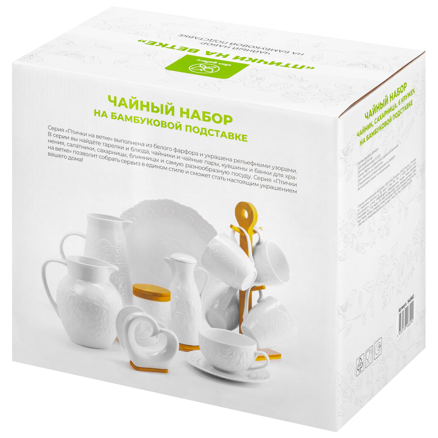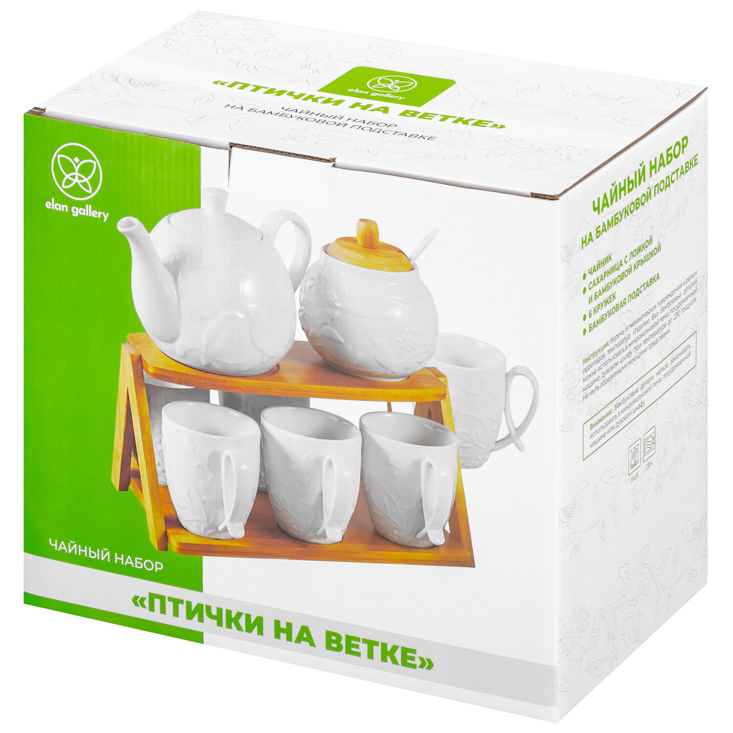 Купить Чайный набор чайник 900 мл, сахарница 620 мл, 6 кружек по 300 мл Elan Gallery Птички на ветке, на бамбуковой подставке