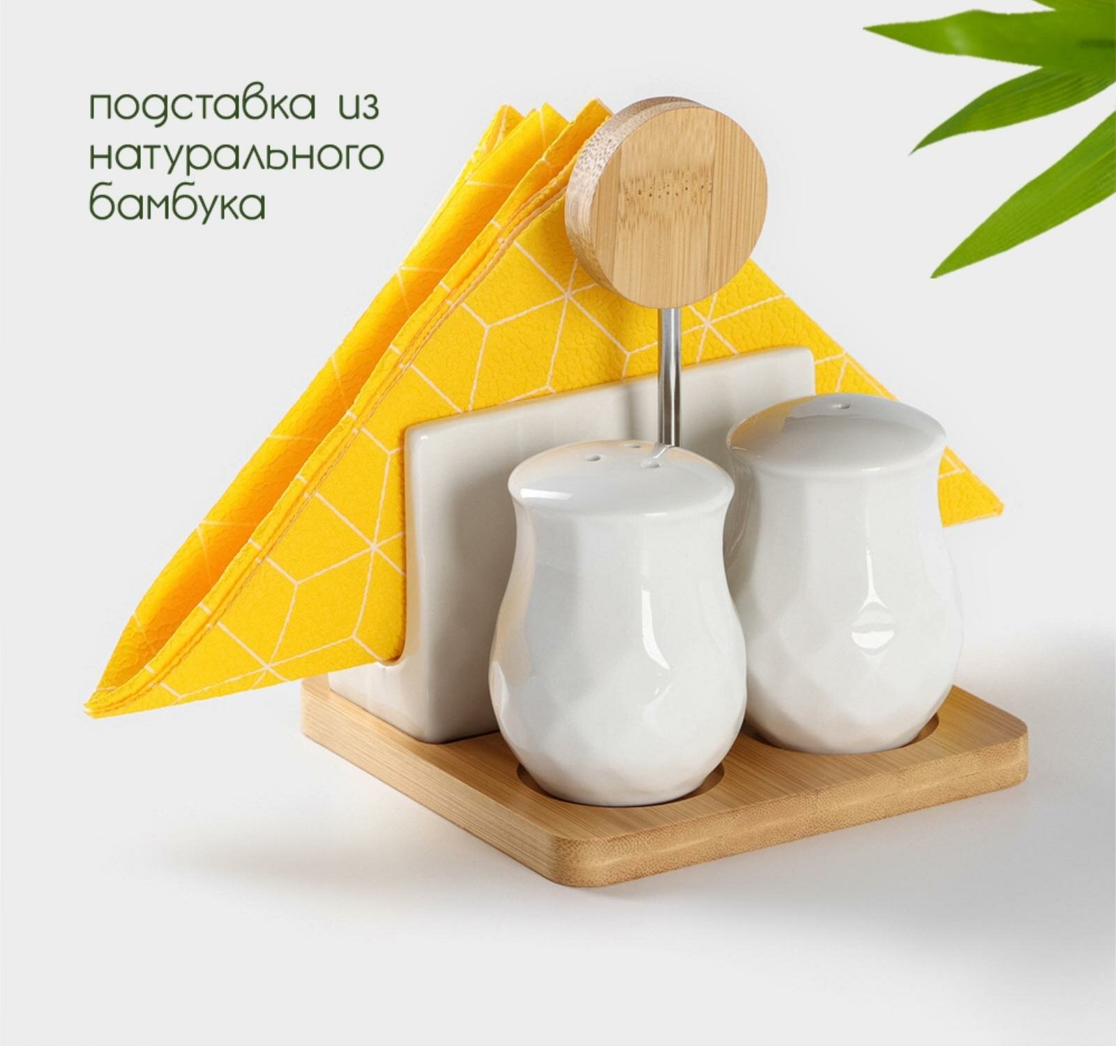 Набор для специй 4 предмета: солонка 110 мл, перечница 110 мл, салфетница, на бамбуковой подставке, фарфор, белый