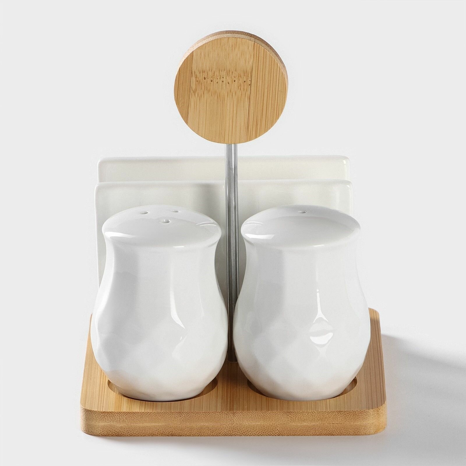 Набор для специй на бамбуковой подставке 3 предмета: солонка 100 мл, перечница 100 мл, салфетница, фарфор, белый