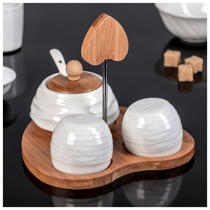 Набор фарфоровый для специй на деревянной подставке BellaTenero, 5 предметов: солонка, перечница, сахарница с ложкой, подставка-держатель, белый интересное: