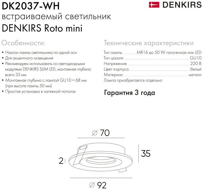 Светильник потолочный встраиваемый DENKIRS DK2037-WH,IP 20, 50 Вт, GU10, белый, алюминий интересное: