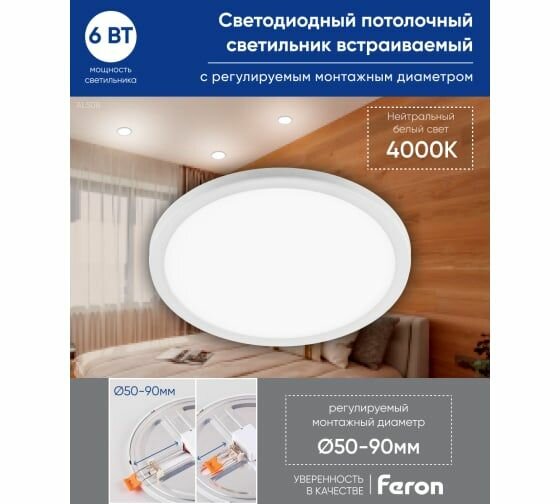 Feron св-к встр. св/д даунлайт под любое отверстие (50-90мм) 6W(480lm) 4000K 4K 100x20 AL508 29725