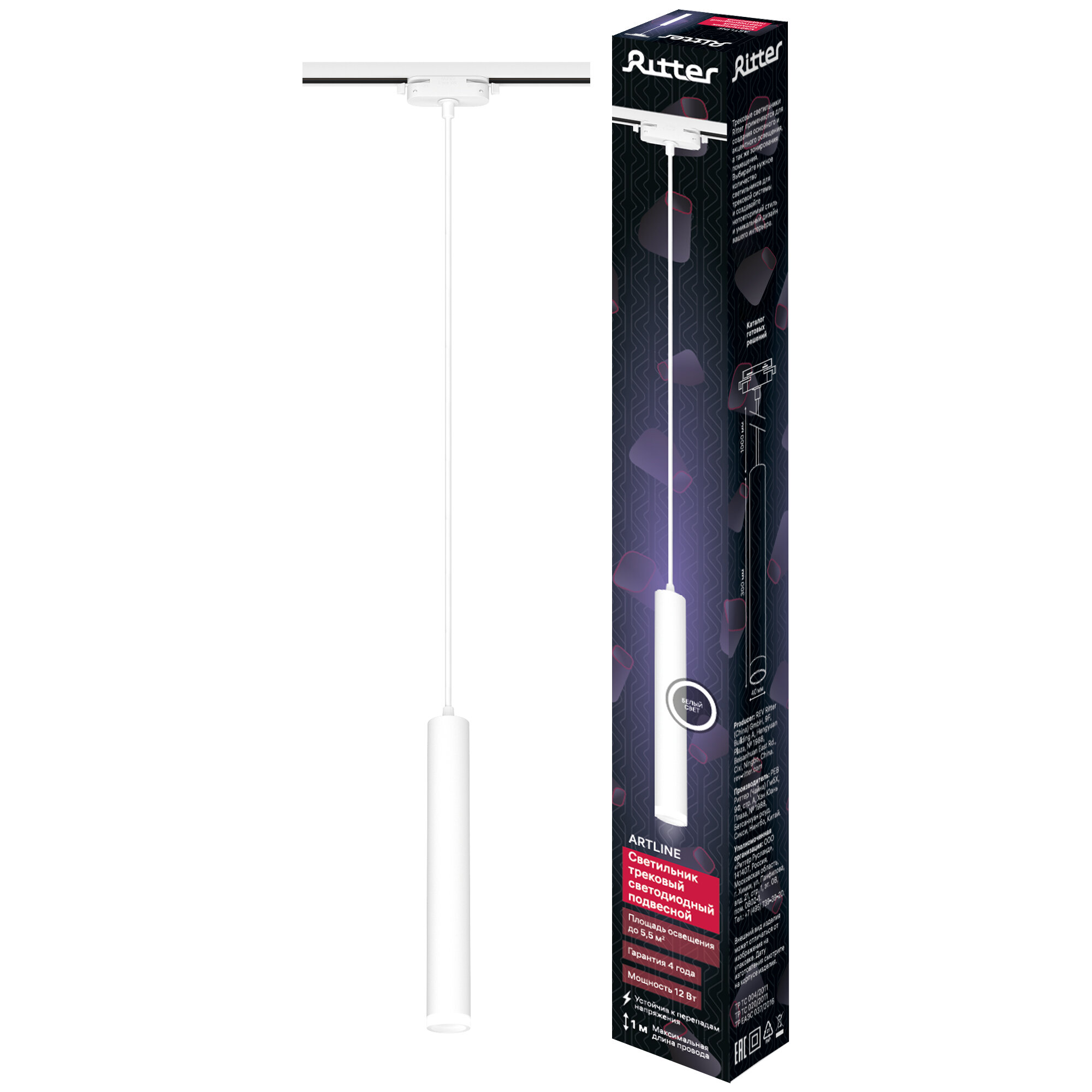 Светильник трековый потолочный подвесной светодиодный однофазный белый, 12Вт, стандартное крепление на любой шинопровод 220В, Ritter ARTLINE 59712 8