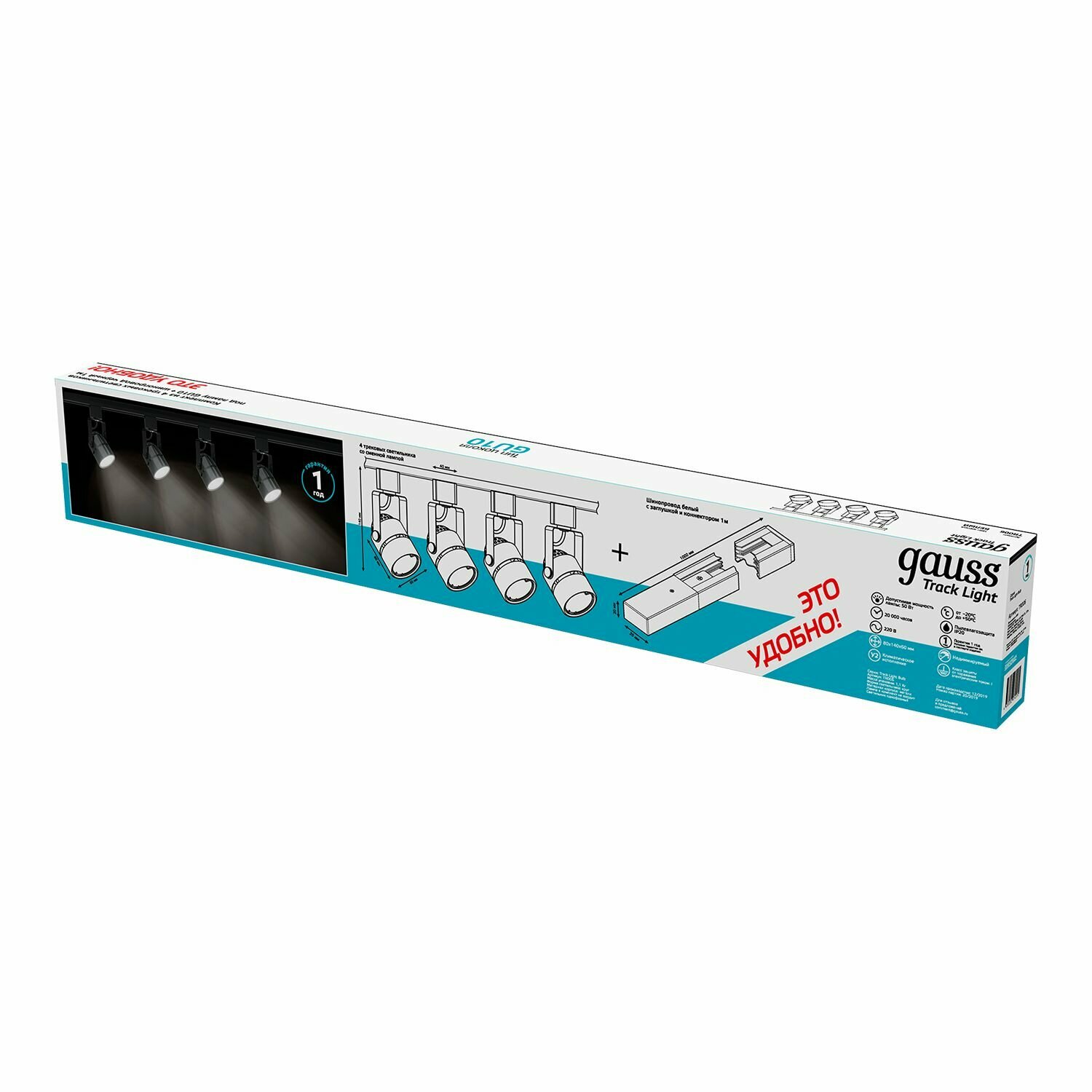 Трековый светильник белый Gauss готовый комплект 4 светильника GU10 220V + шинопровод 1м