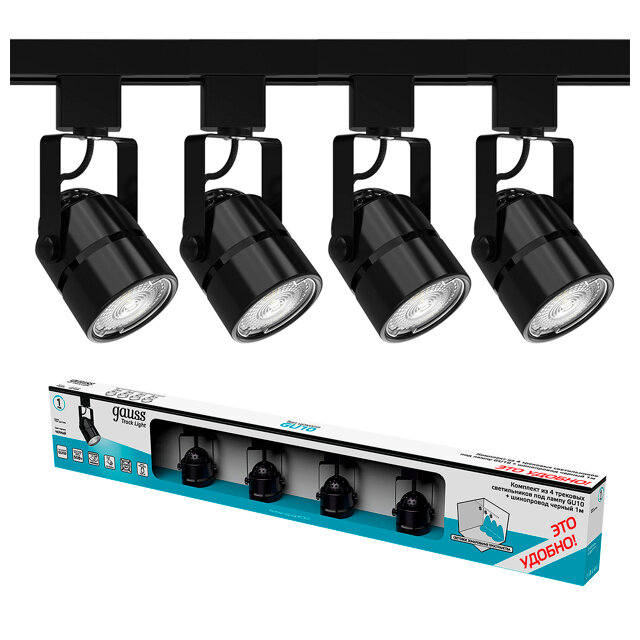 Купить Трековый светильник черный Gauss готовый комплект 4 светильника GU10 220V + шинопровод 1м