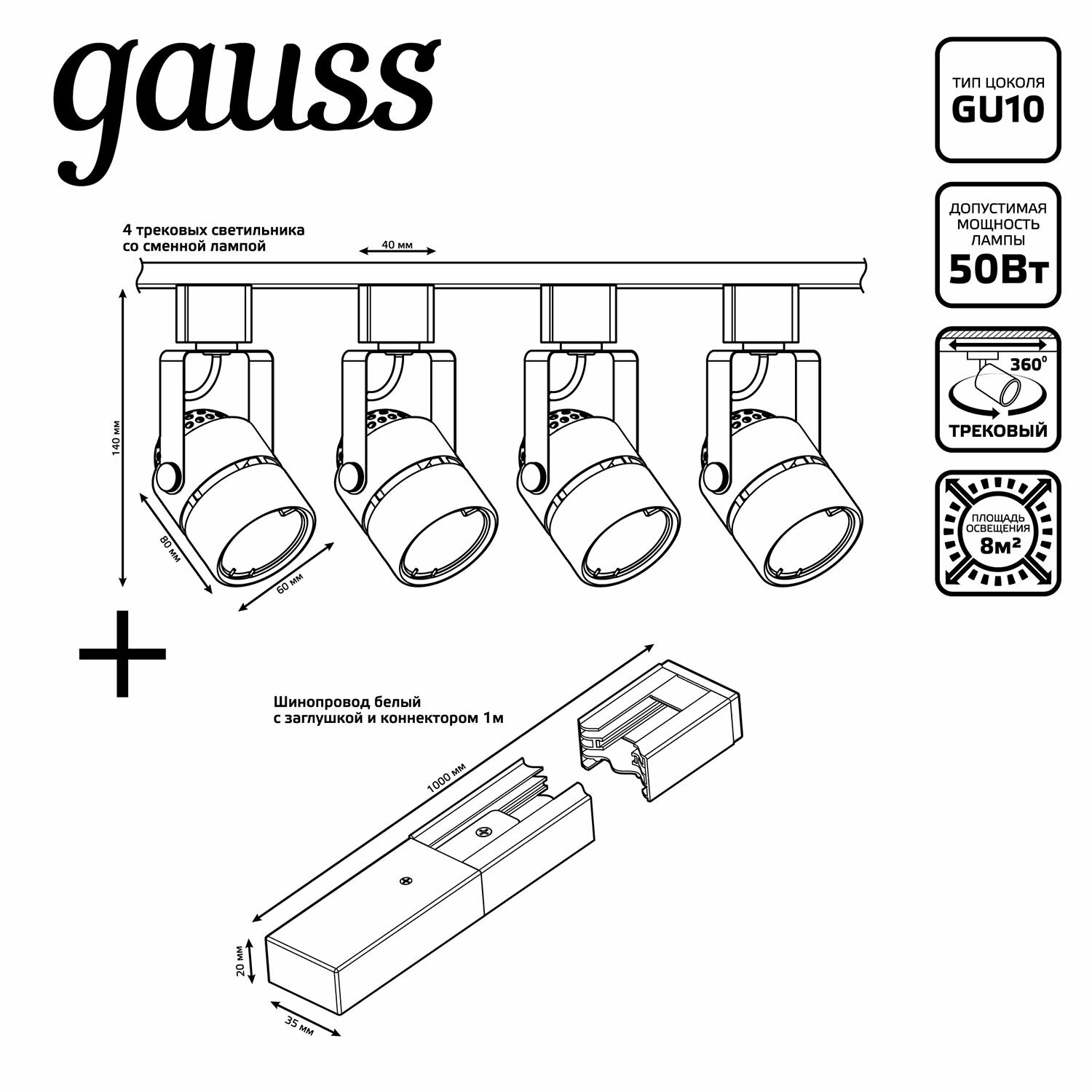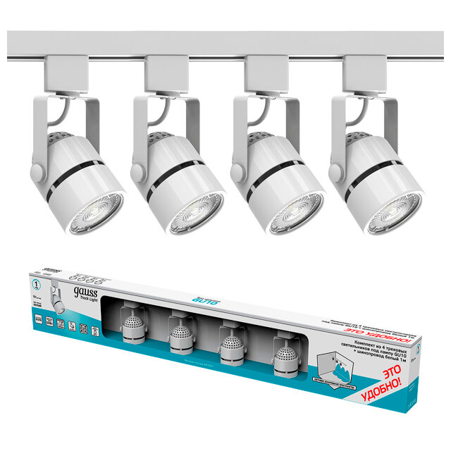 Купить Трековый светильник белый Gauss готовый комплект 4 светильника GU10 220V + шинопровод 1м