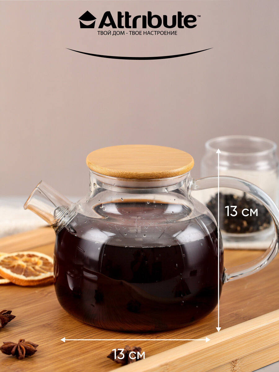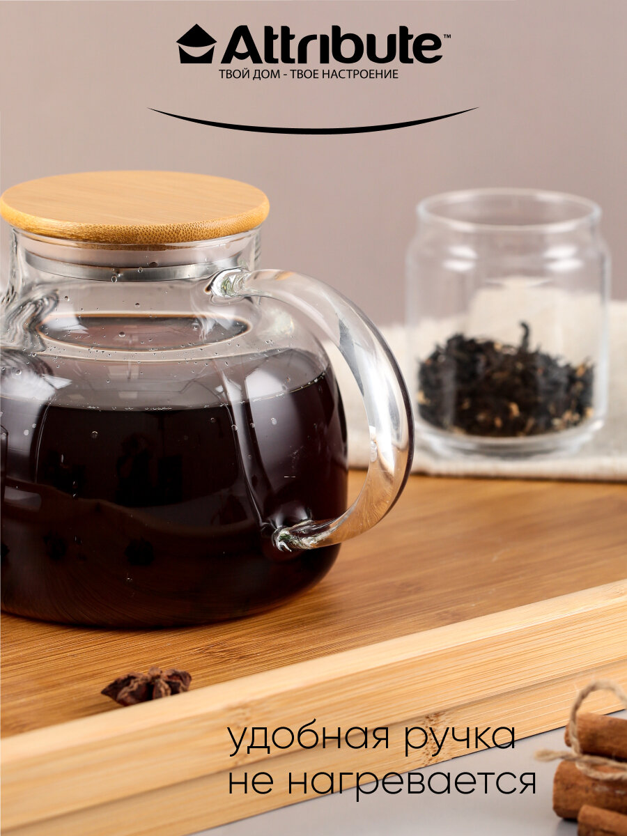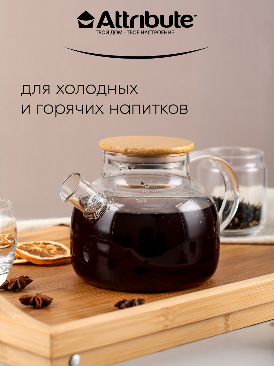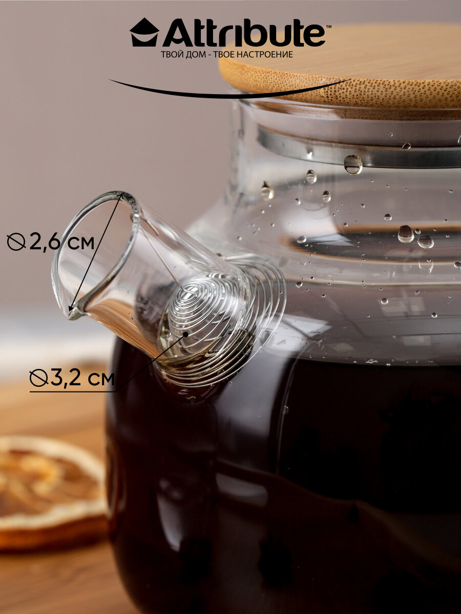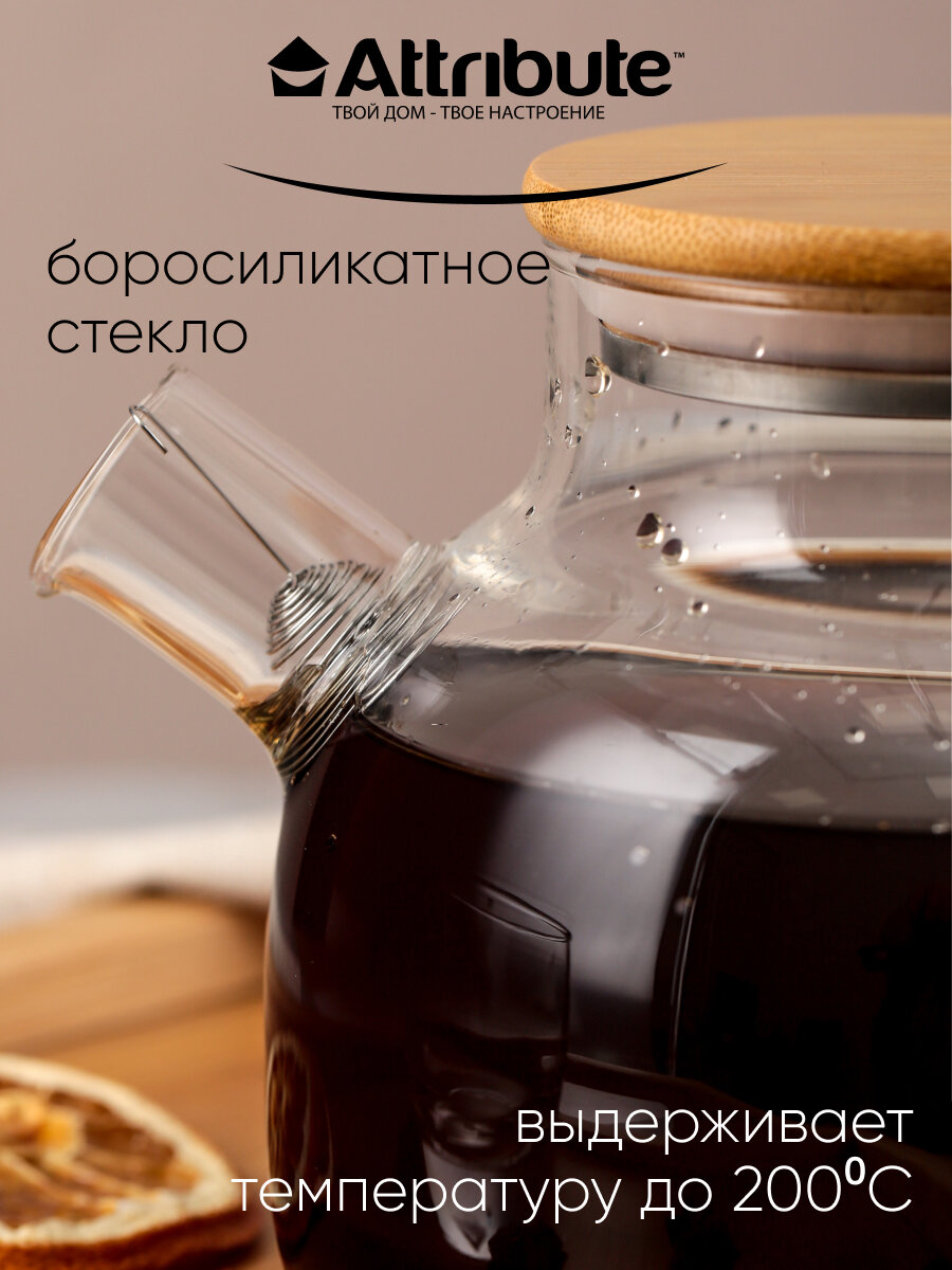 Чайник заварочный attribute pure 1,8л стекло, бамбук, нерж.сталь