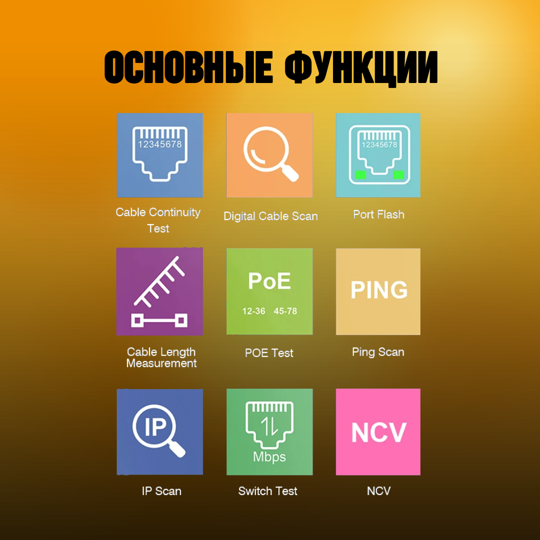 | Дополнительная информация | Определение типа PoE-питания; оценка энергопотребления; проверка качества Ethernet-кабеля; оценка мощности, силы тока и напряжения; Loopback - проверка отклика коммутатора на сигнал, посылаемый тестером. |