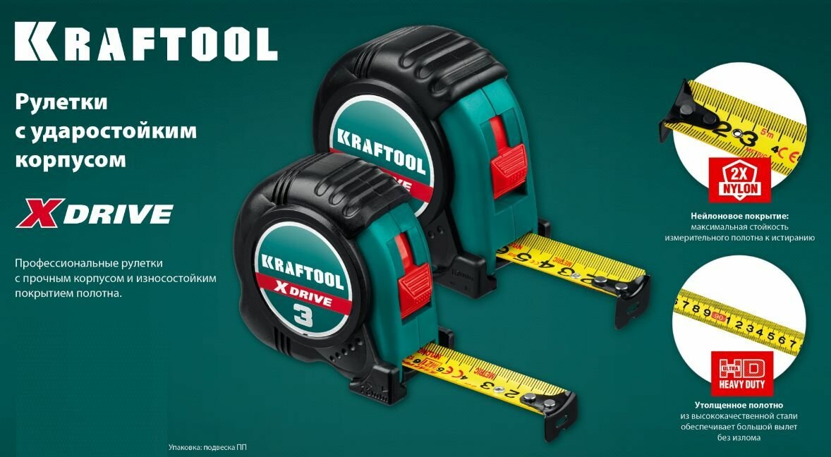 KRAFTOOL 10 м х 25 мм, ударостойкий обрезиненный корпус, рулетка X-Drive 34122-10