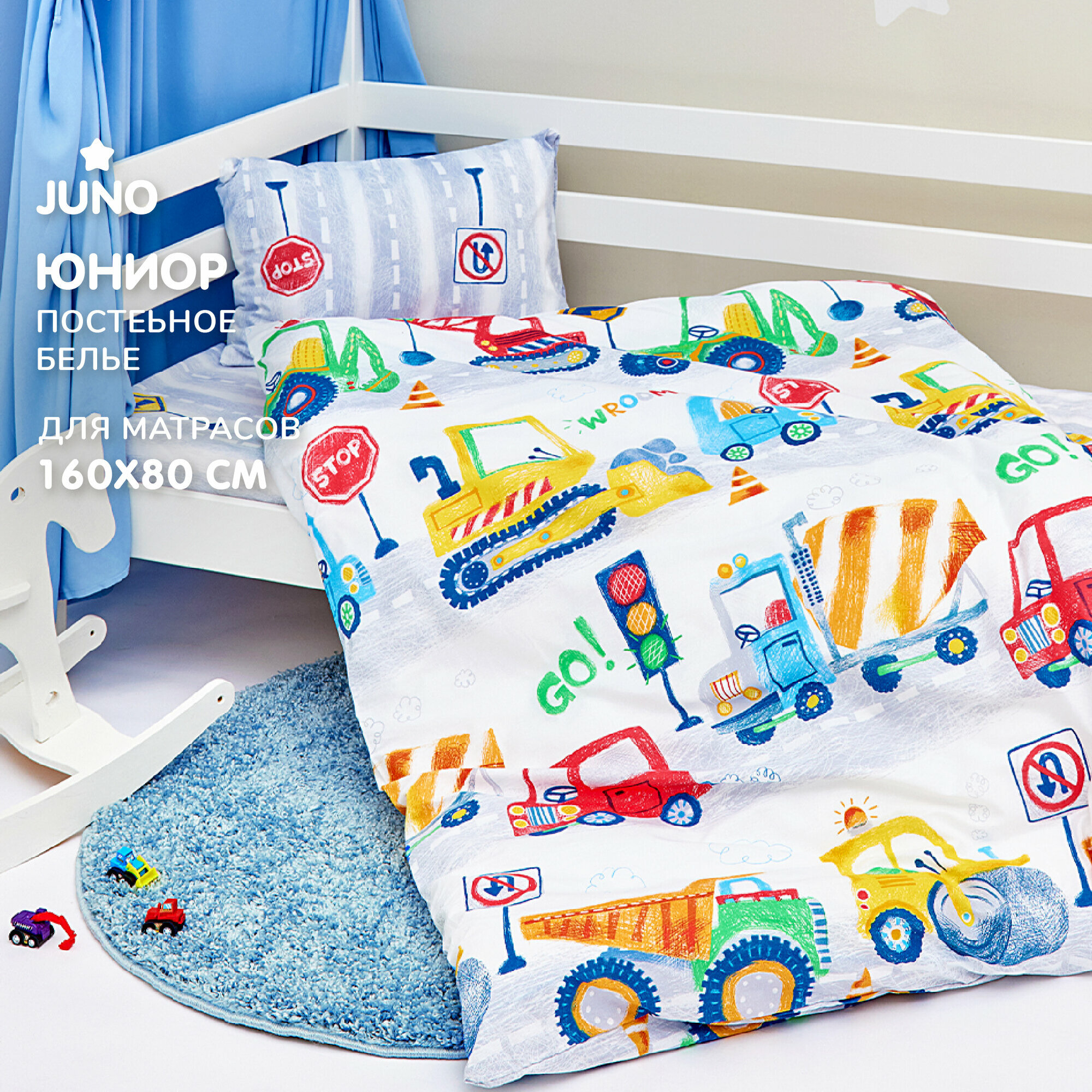 СохранитьПостельное белье детское 160х80 юниор Juno, поплин хлопок, 1 наволочка 40х60, детское постельное белье в кроватку Road transport / Строительный транспорт, комплект для малыша, для мальчика интересное: