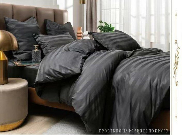 Постельное белье евро двуспальное черный CandiesMency страйп сатин, простынь на резинке 180x200+25