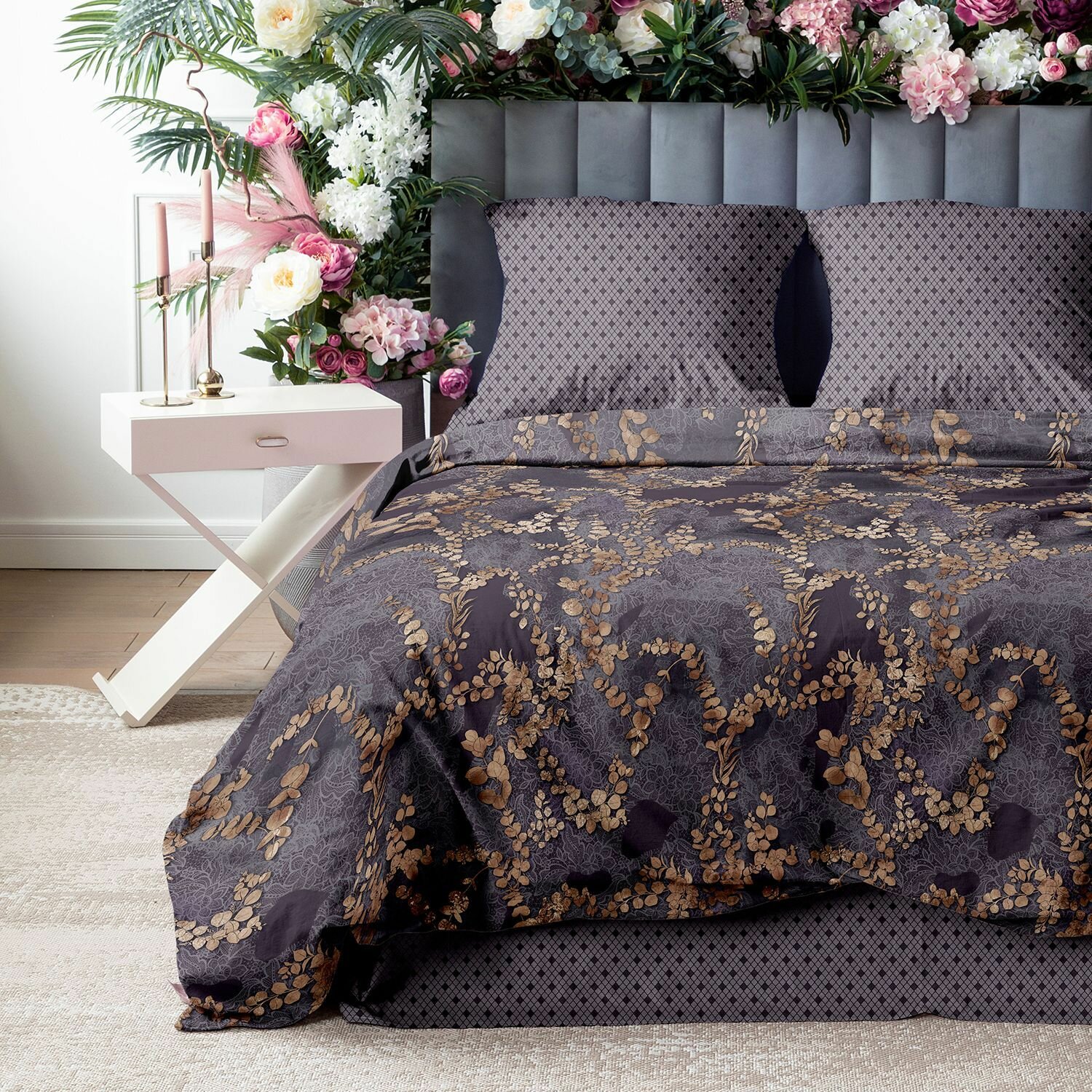 Постельное белье 2 спальное Mia Cara, Перкаль, 4 нав. (50х70-2шт; 70х70-2шт), на резинке, Таинственный сад , фиолетовый