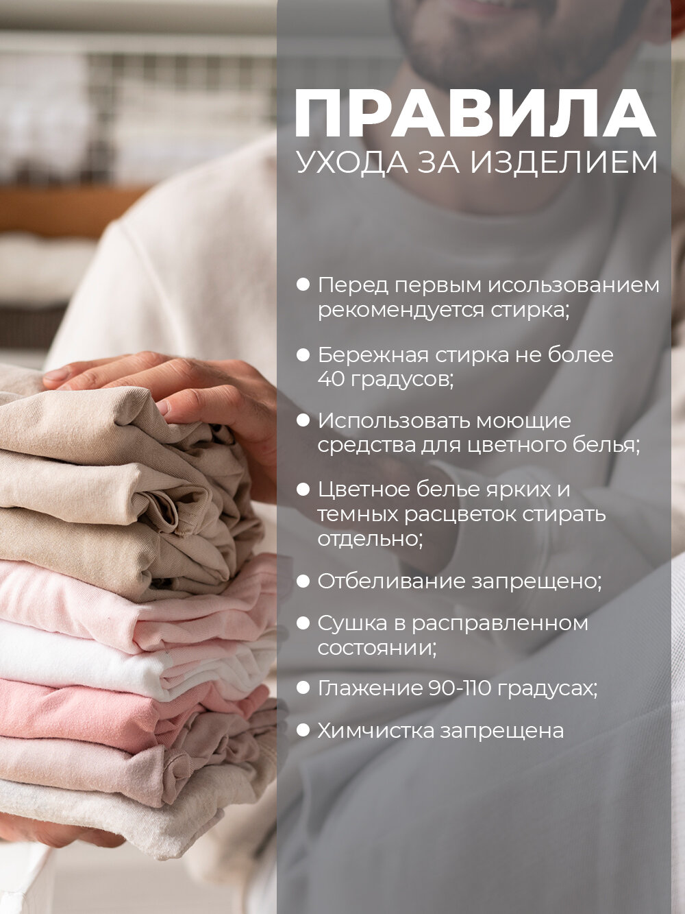 | Дополнительная информация | Необходима предварительная стирка перед первым применением. Перед стиркой вывернуть на изнаночную сторону. При наличии молний / клёпок / пуговиц на постельном белье, их обязательно застегнуть. Машинная стирка при температуре 30 40С, деликатный режим. Стирать жидкими или гелеобразными моющими средствами. Не выкручивать. Не отбеливать. Не сушить в барабане. Химчистка не допускается. Можно не утюжить. Усадка после стирки 5% от заявленных размеров изделия. |