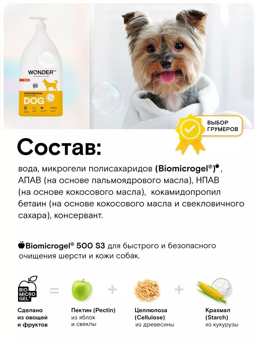 Эко шампунь для собак и щенков гипоаллергенный WONDER LAB, для мытья шерсти и лап длинношерстных и короткошерстных пород, без запаха, 1000 мл