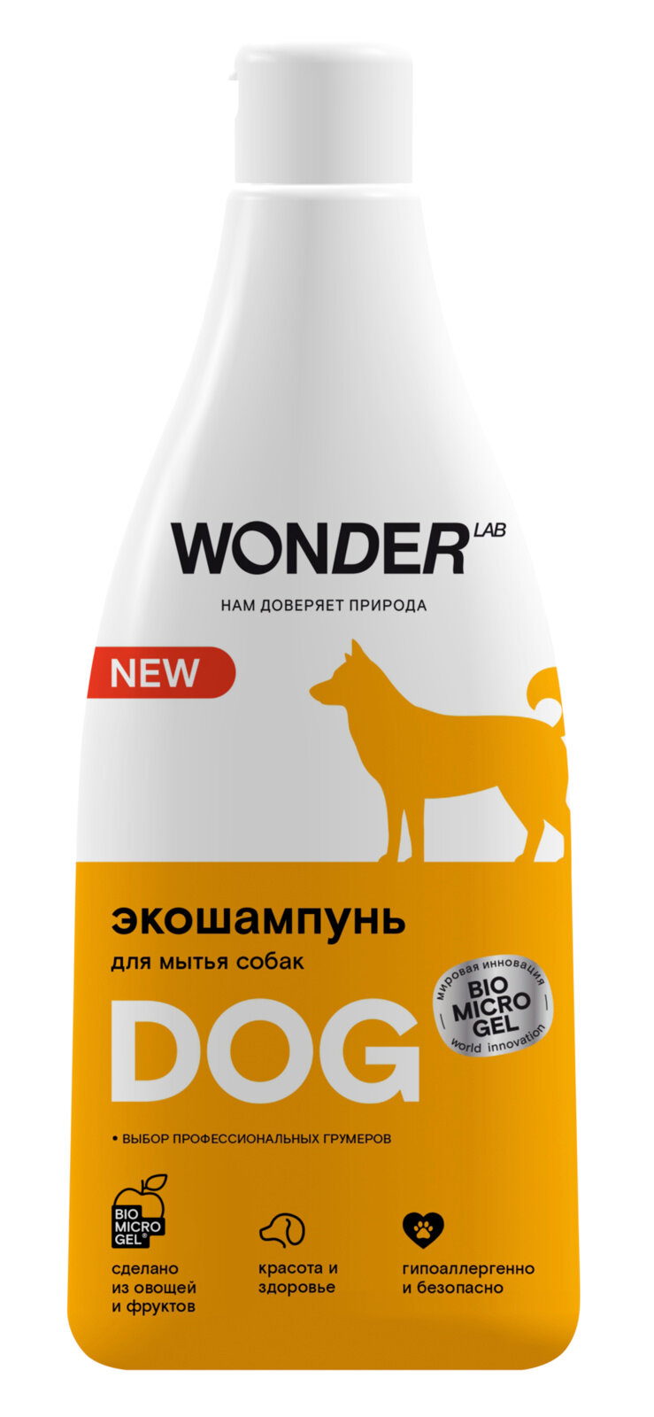 Шампунь для собак и щенков гипоаллергенный WONDER LAB, для мытья шерсти и лап длинношерстных и короткошерстных пород, без запаха, 550 мл
