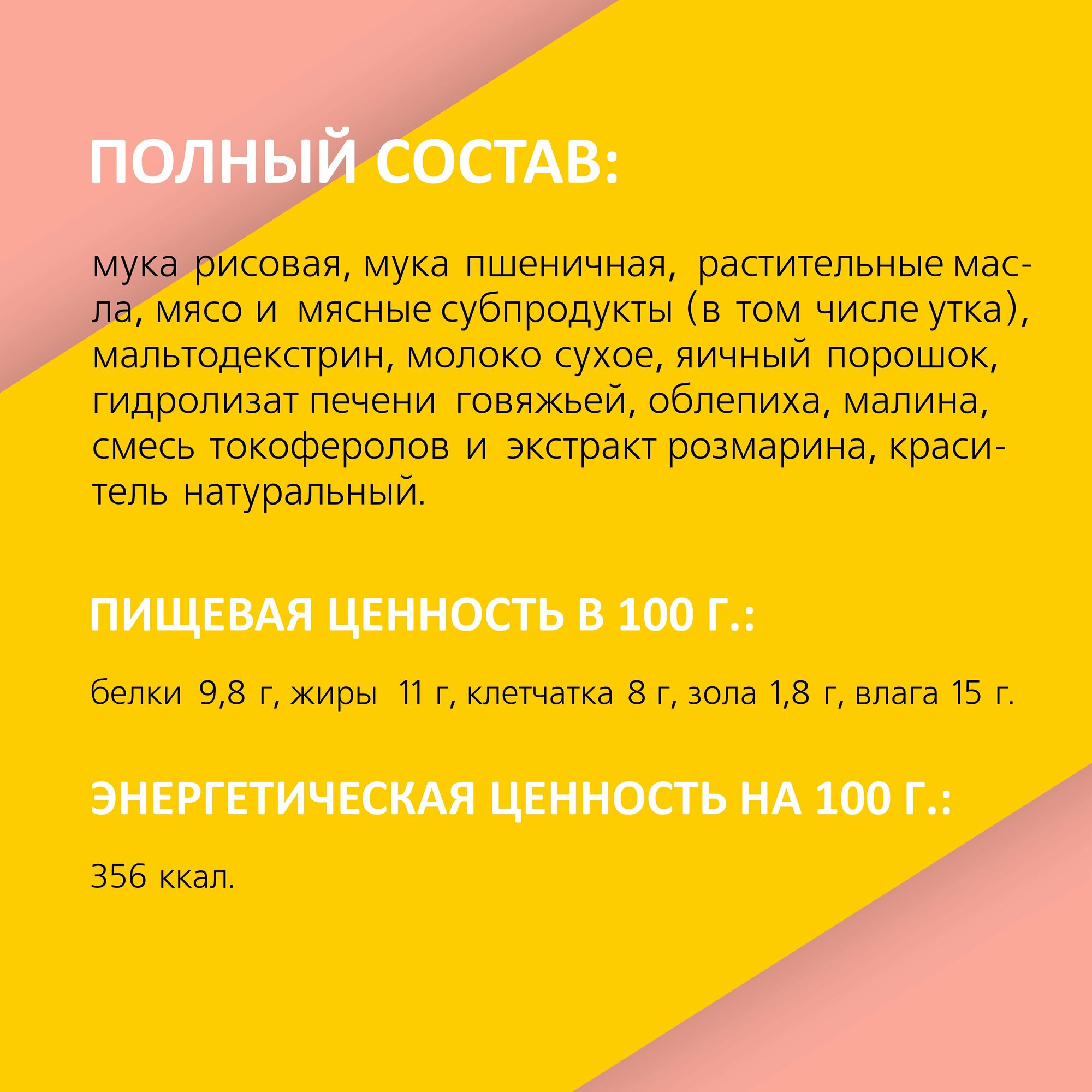 | Состав | Мука рисовая, мука пшеничная, растительные масла, мясо и мясные субпродукты (в том числе утка), мальтодекстрин, молоко сухое, яичный порошок, гидролизат печени говяжьей, облепиха, малина, смесь токоферолов и экстракт розмарина, краситель натуральный. |