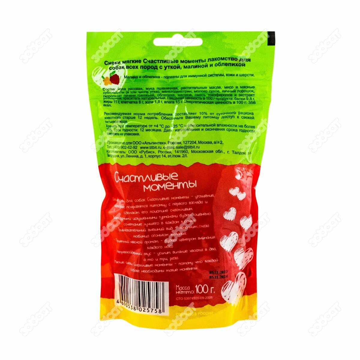 Лакомство для собак всех пород TiTBiT Снеки мягкие с уткой, малиной и облепихой “Счастливые моменты” 100 г интересное: