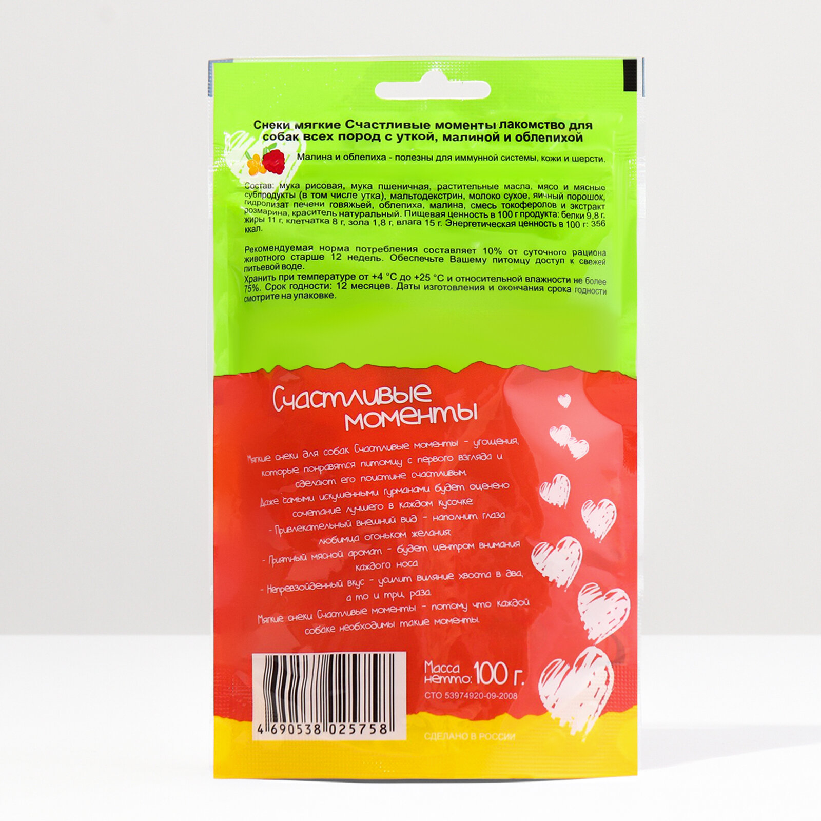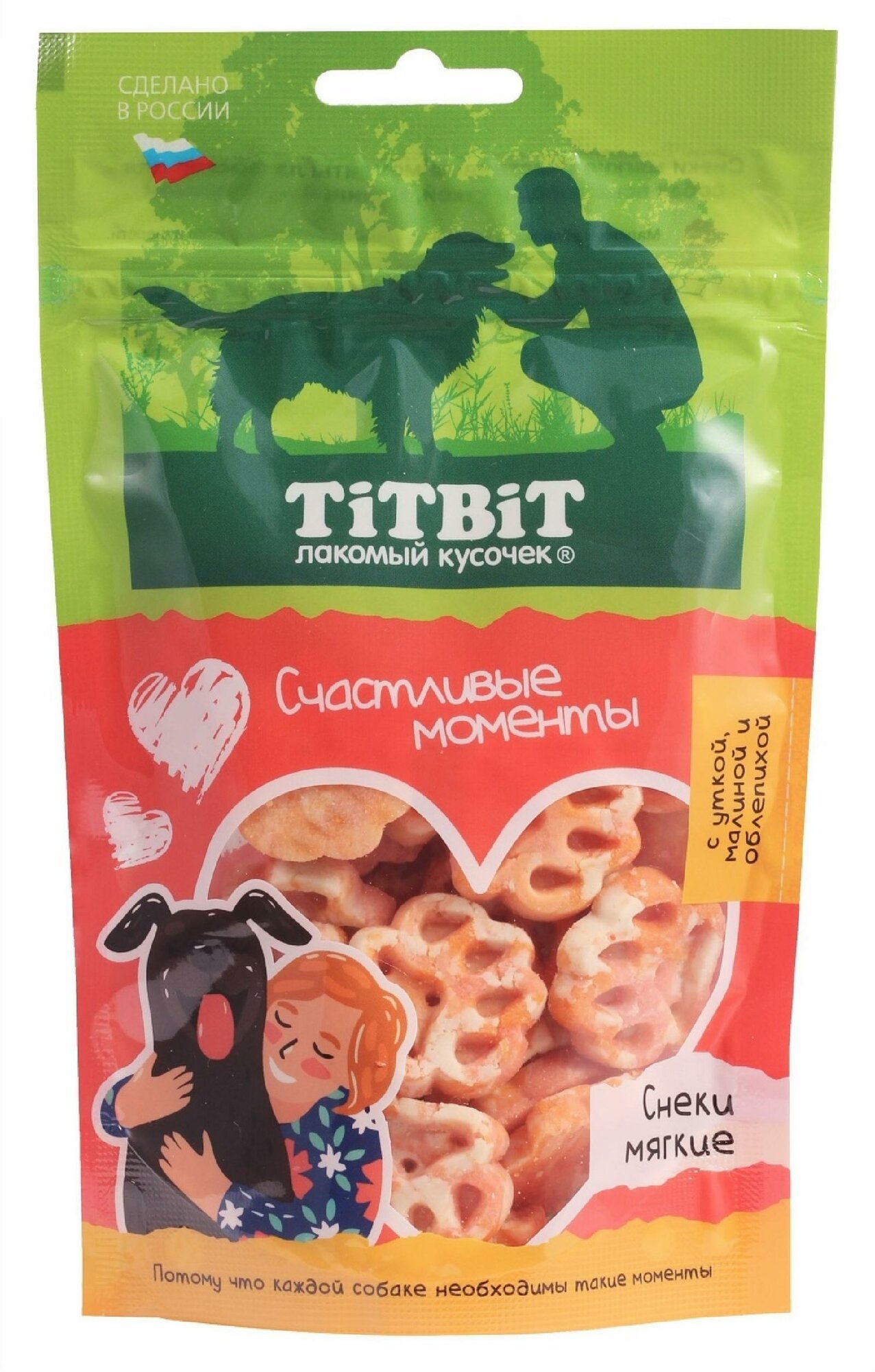 Лакомства для собак Titbit - Счастливые моменты, Снеки мягкие, с уткой, малиной и облепихой,100г,1шт