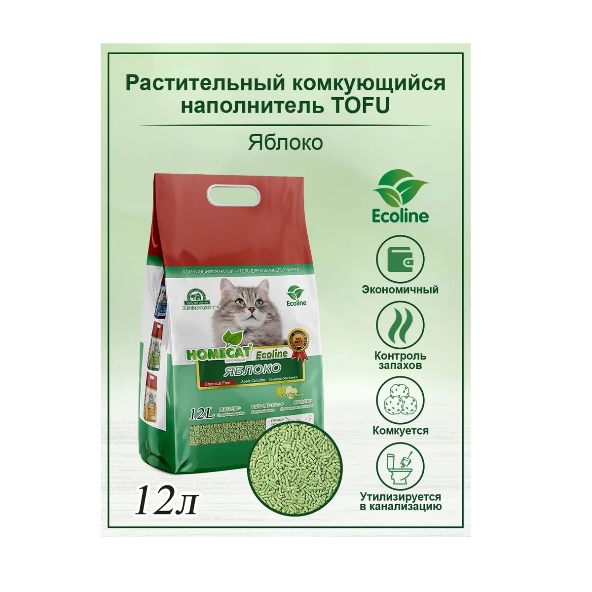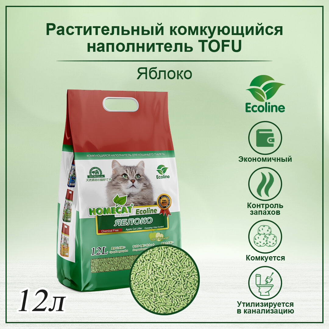 Купить HOMECAT Эколайн Яблоко 12 л комкующийся наполнитель тофу для кошачьих туалетов с ароматом яблока