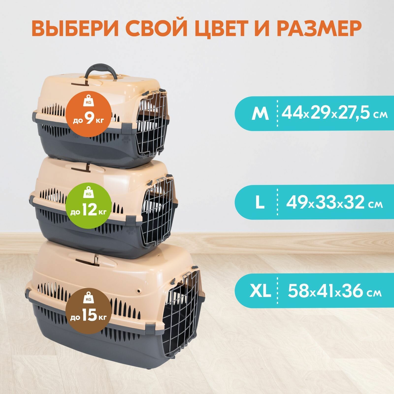 Переноска для животных до 12 кг "Пижон" 49х33х32см, металлическая дверь, бежево-серая, 4940331