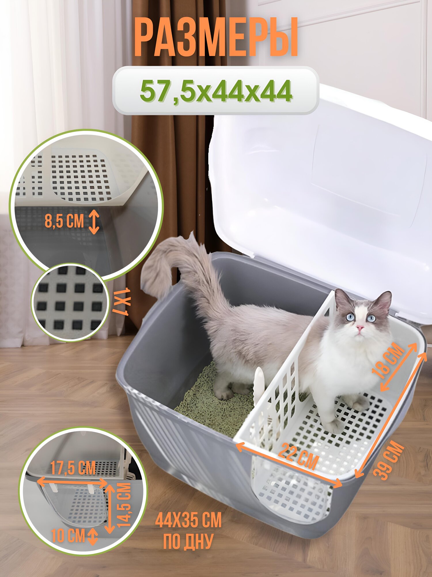 Купить Закрытый лоток-туалет для кошек с откидной крышкой, секцией решеткой для чистоты лапок и совком "Чистый Котик" 57,5х44х44 см., серый