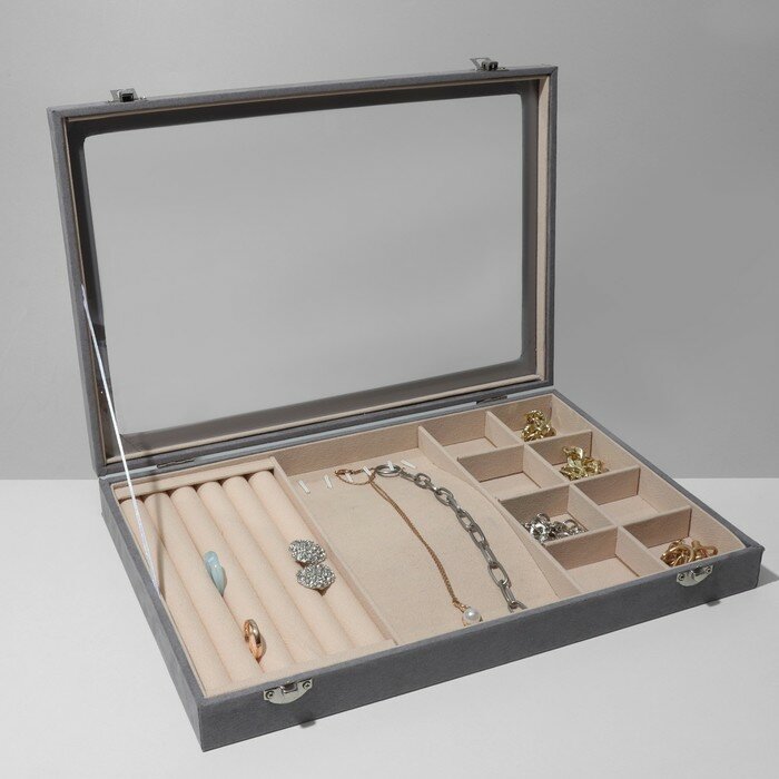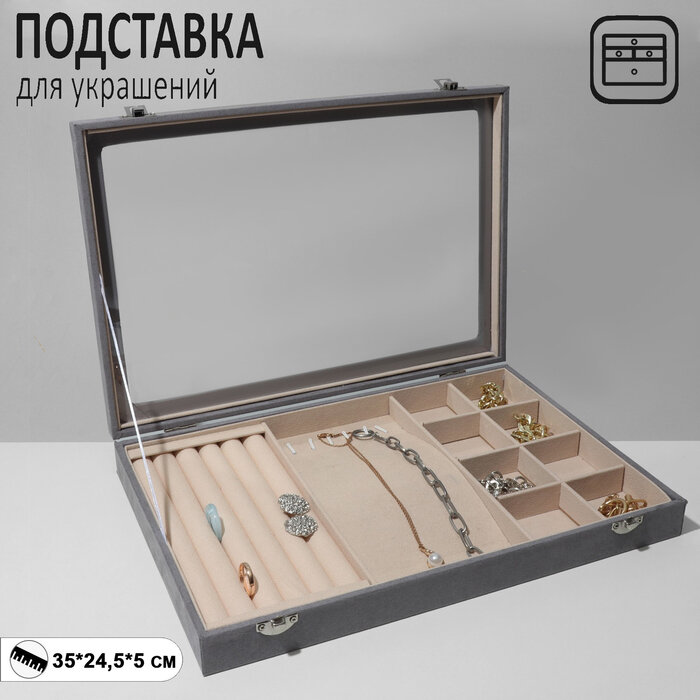 Купить Подставка для украшений «Шкатулка» 5 рядов, 6 крючков, 8 ячеек, флок, 35×24,5×5, цвет серо-бежевый(10 шт.)