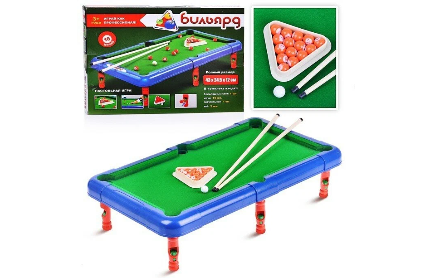 | Комплектация | бильярдный стол, мячи-16 штук, кий-2 штуки, треугольник |