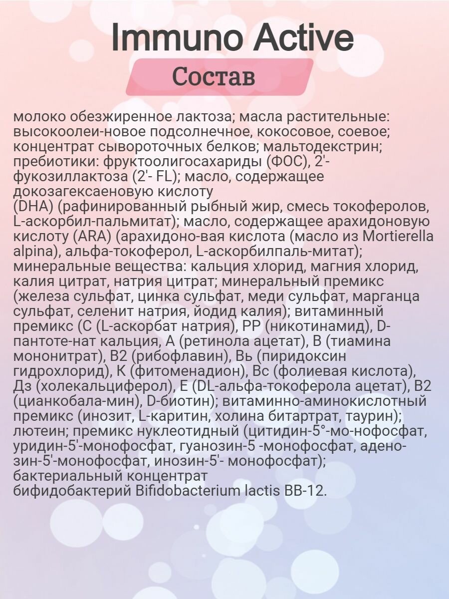 | Состав | молоко обезжиренное; лактоза; масла растительные: высокоолеиновое подсолнечное, кокосовое, соевое; концентрат сывороточных белков; мальтодекстрин; пребиотики: фруктоолигосахариды (ФОС), 2'-фукозиллактоза (2'-FL); масло, содержащее докозагексаеновую кислоту (DHA) (рафинированный рыбный жир, смесь токоферолов, аскорбил пальмитат), масло, содержащее арахидоновую кислоту (ARA); минеральные вещества; витаминный премикс; витаминно-аминокислотный премикс; премикс нуклеотидный: цитидин-5'-монофосфат, уридин-5'-монофосфат, гуанозин-5'-монофосфат, аденозин-5'-монофосфат, инозин-5'-монофосфат, бактериальный концентрат бифидобактерий Bifidobacterium lactis BB-12, лютеин |