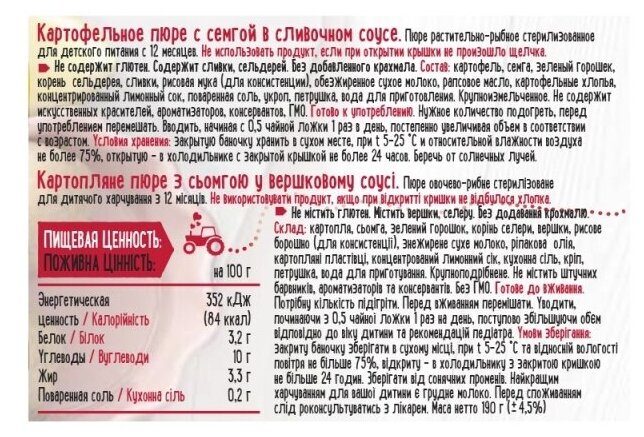 | Состав | картофель, семга, зеленый горошек, корень сельдерея, сухое обезжиренное молоко, сливки, рисовая мука (для консистенции), обезжиренное сухое молоко, рапсовое масло, картофельные хлопья, концентрированный лимонный сок, поваренная соль, укроп, петрушка, вода для приготовления |