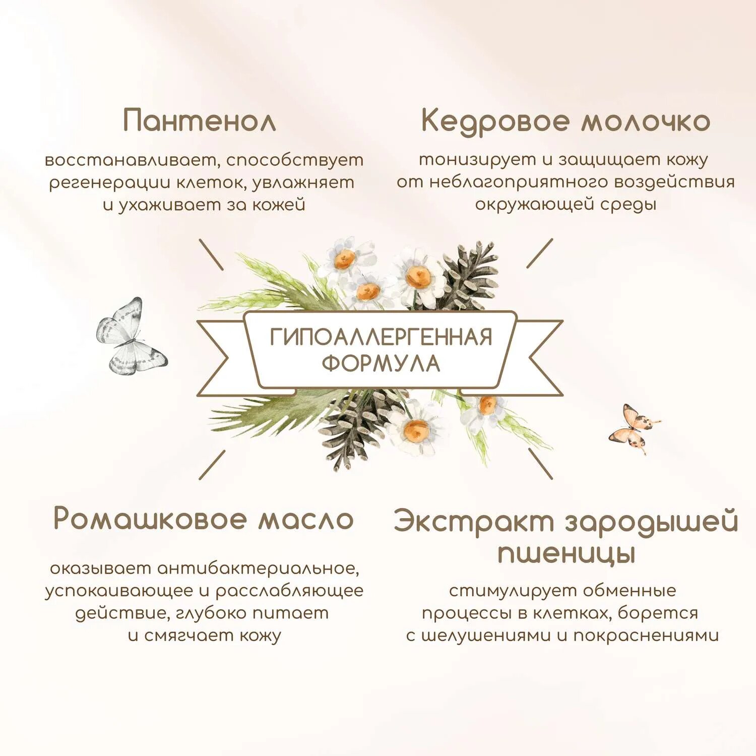 | Состав | Aqua with infusions of Triticum Vulgare Germ Extract (экстракт зародышей пшеницы); Pinus Sibirica Needle Extract, Pinus Sibirica Seed Oil, Pinus Sibirica Seed Oil Polygliceryl-6 Esters (кедровое молочко), Bidens Tripartita Flower/Leaf/Stem Extract (экстракт череды), Helianthus Annuus Seed Oil, Chamomilla Recutita Oil (ромашковое масло), Glycerin, Cetearyl Alcohol, Glyceryl Stearate, Isopropyl Palmitate, Glyceryl Linoleate, Glyceryl Oleate, Glyceryl Linolenate (витамин F), Panthenol (пантенол), Octyldodecanol, Olive Glycerides, Ceramide NP (комплекс церамидов), Xanthan Gum, Sodium Stearoyl Glutamate, Benzyl Alcohol, Dehydroacetic Acid, Tocopherol (витамин Е), Citric Acid, Sodium Benzoate, Potassium Sorbate. Parfum, Citronellols, Coumarin. |