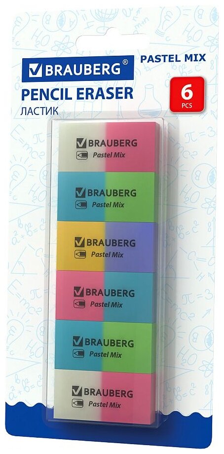 Ластик/резинка стирательная/стерка канцелярская для простого/чернографитного карандаша Brauberg Pastel Mix, 6 шт, цвета ассорти, 44х21х10 мм, экологичный Пвх, 229597