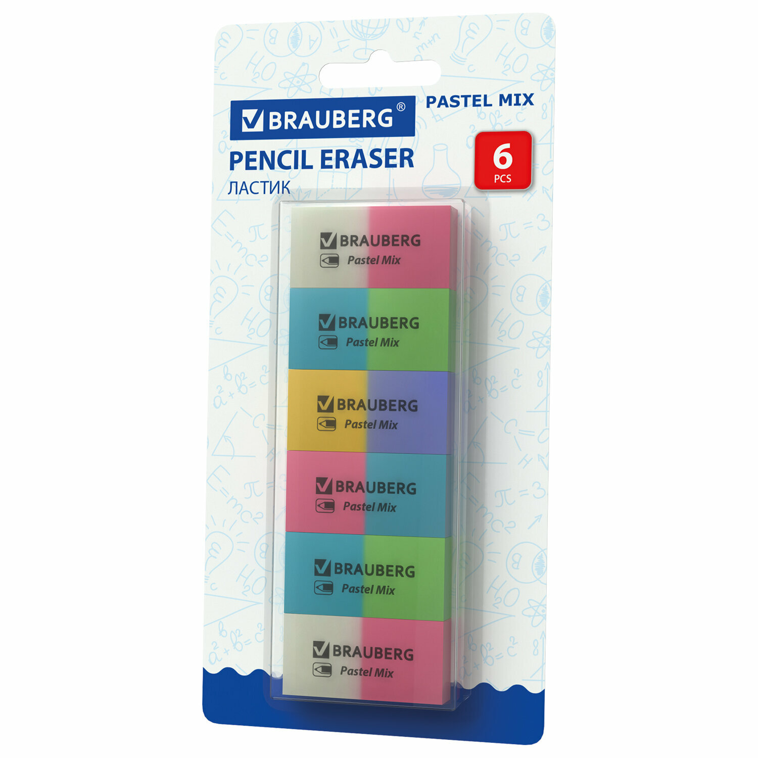 Купить Ластик/резинка стирательная/стерка канцелярская для простого/чернографитного карандаша Brauberg Pastel Mix, 6 шт., цвета ассорти, 44х21х10 мм, экологичный Пвх, 229597