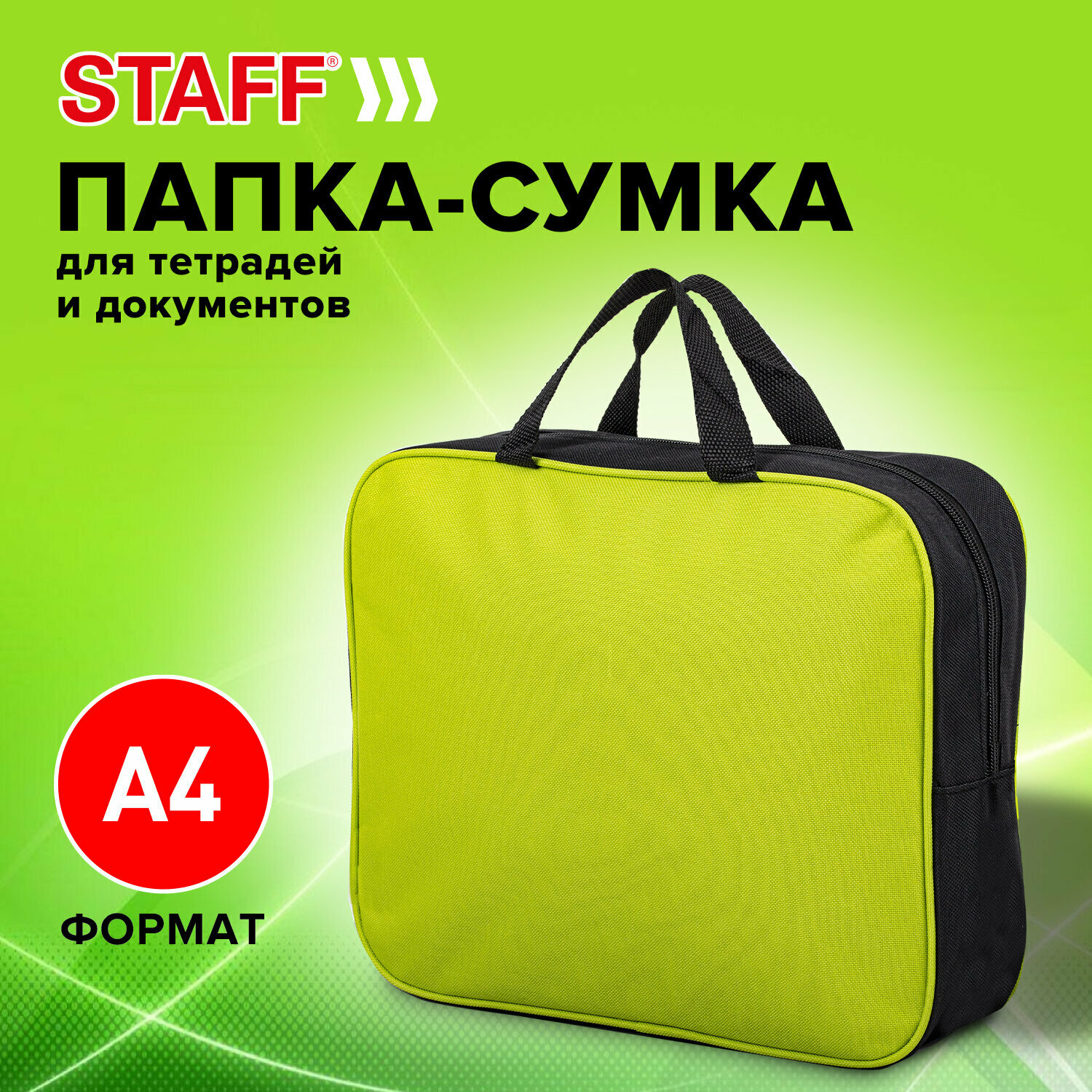 Папка на молнии с ручками STAFF EVERYDAY, А4, ширина 80 мм, полиэстер, зеленая, 270742, в комплекте 1шт