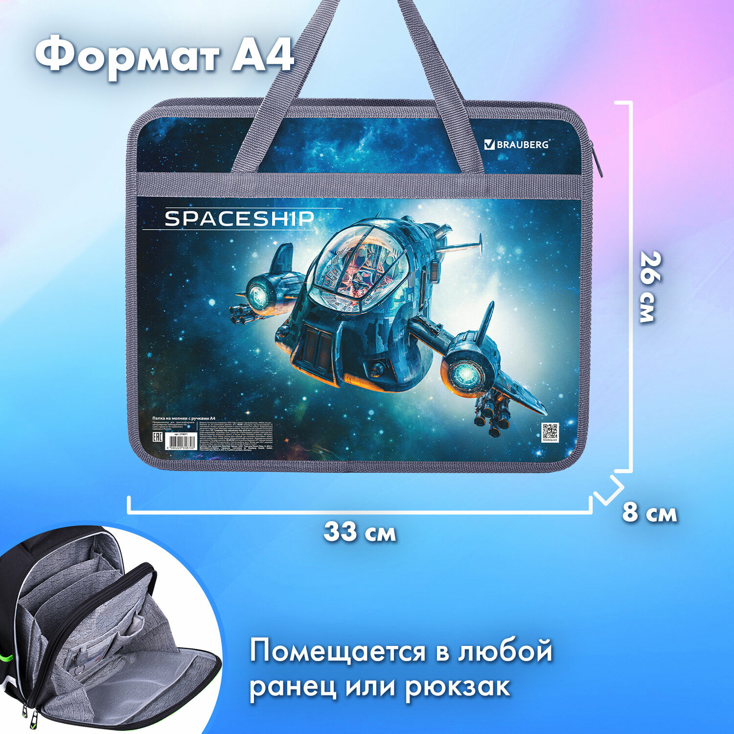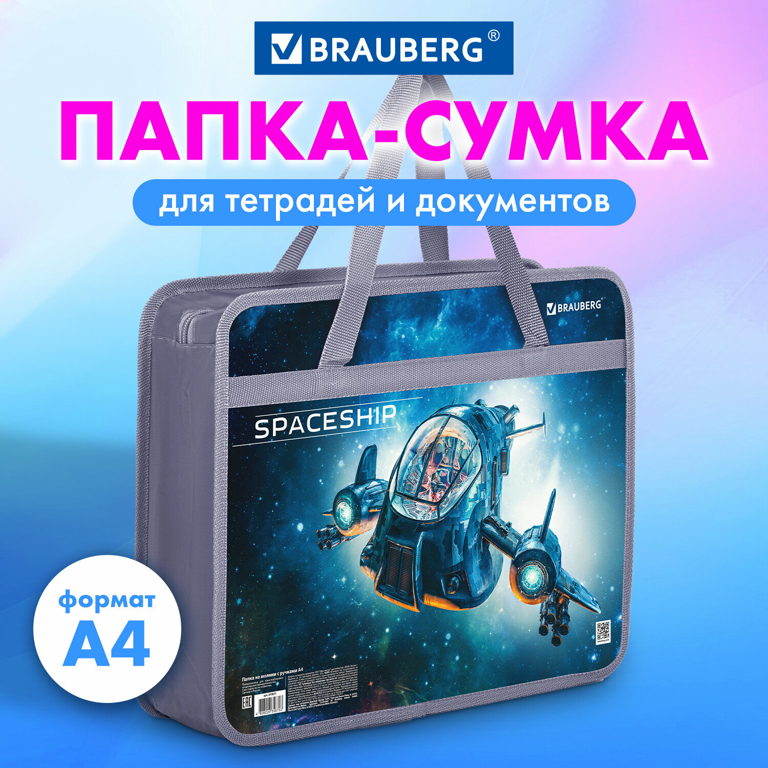 Папка на молнии с ручками Brauberg А4, 1 отделение, пластик, ширина 80 мм "Space trip"