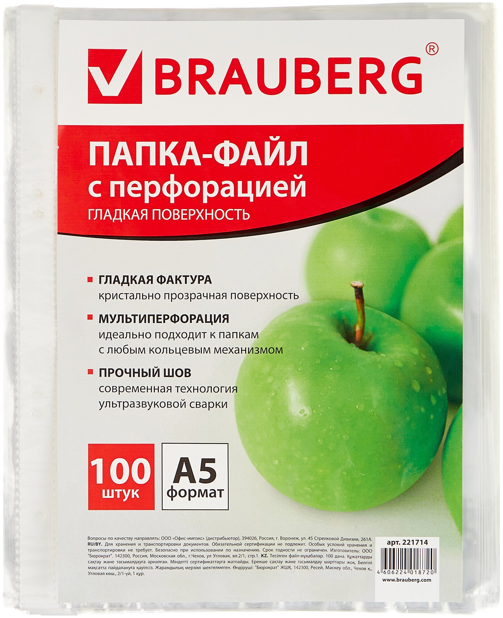 Папки-файлы Brauberg Перфорированные А5, вертикальные, 100 шт, гладкие, Яблоко, 35 мкм (221714)