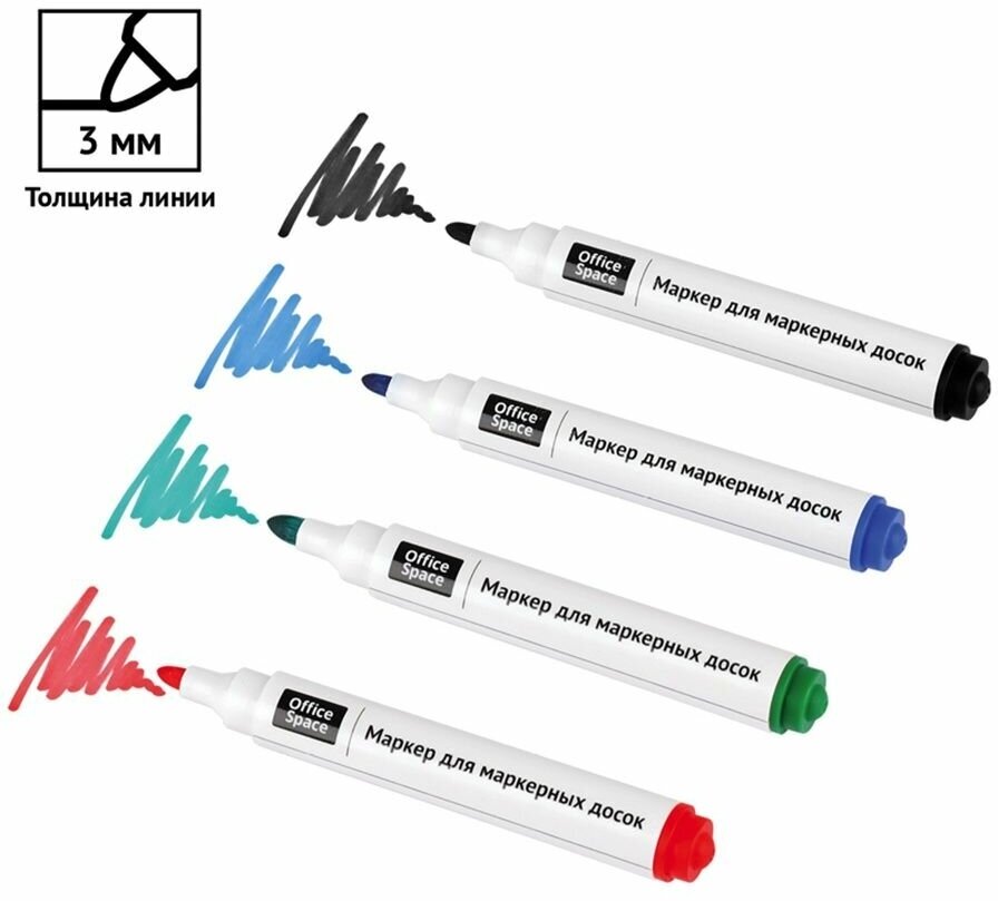 Набор маркеров для белых досок OfficeSpace 4цв, пулевидный, 3мм