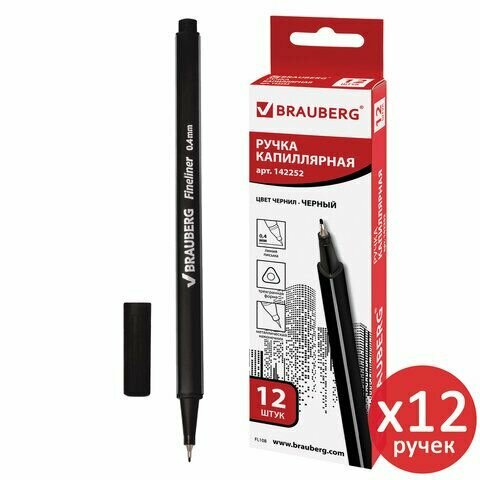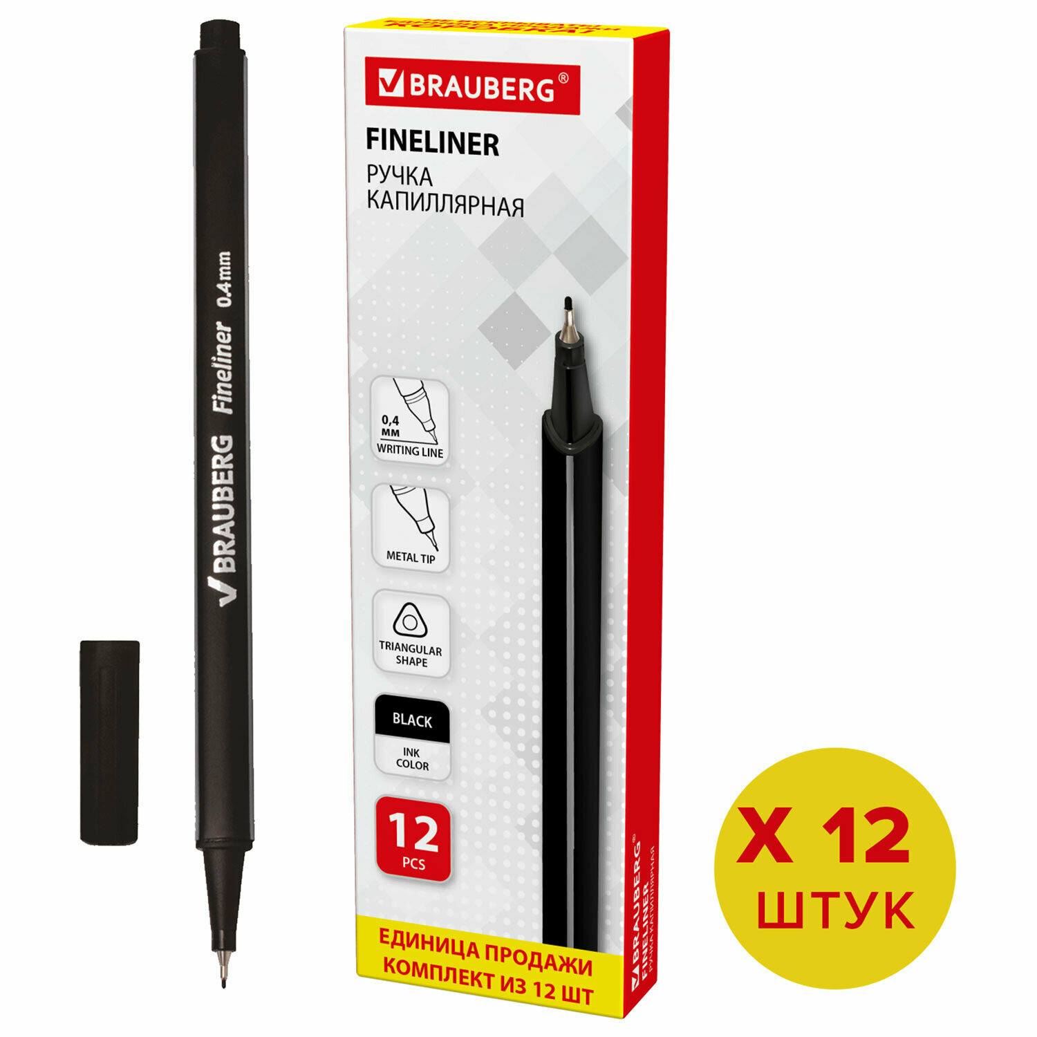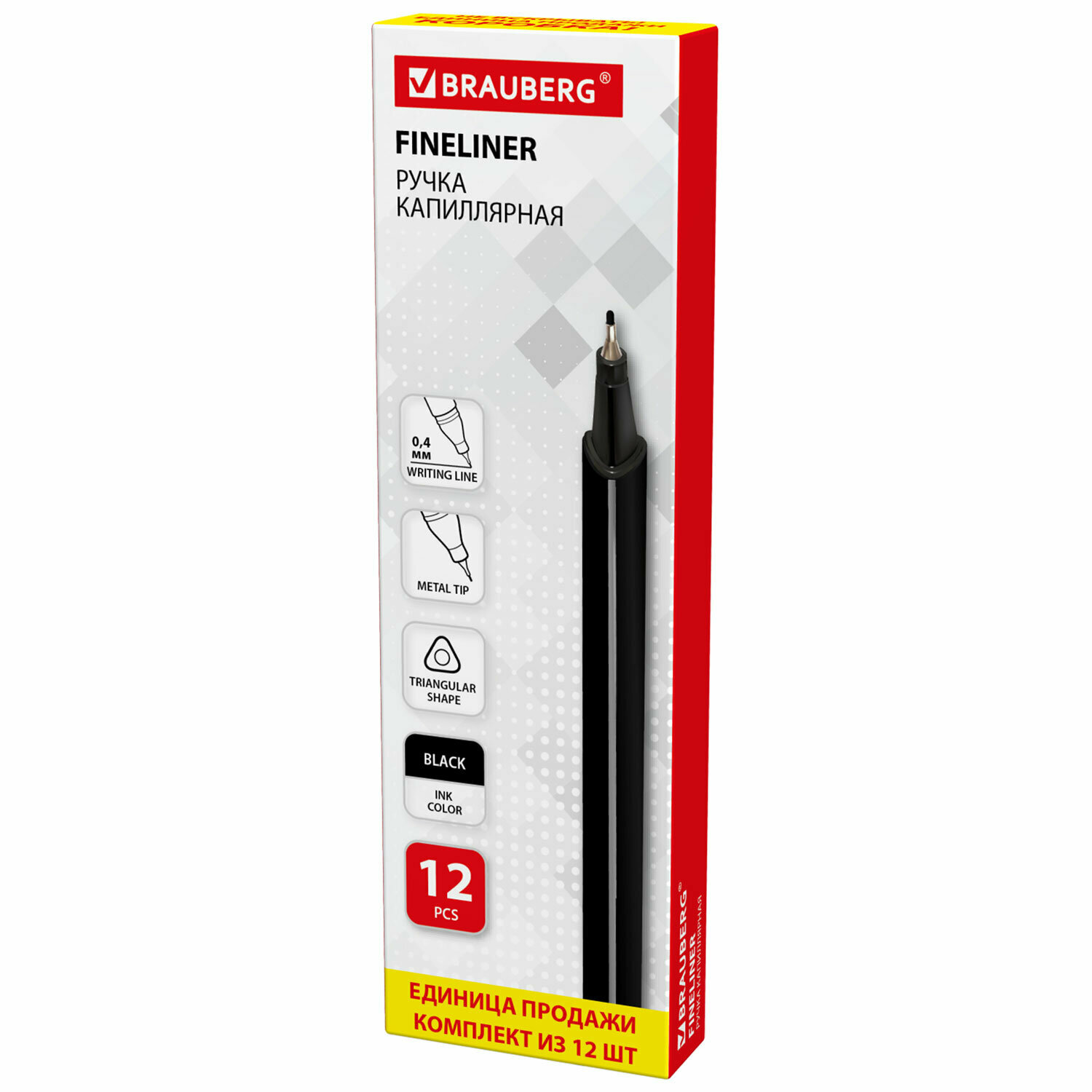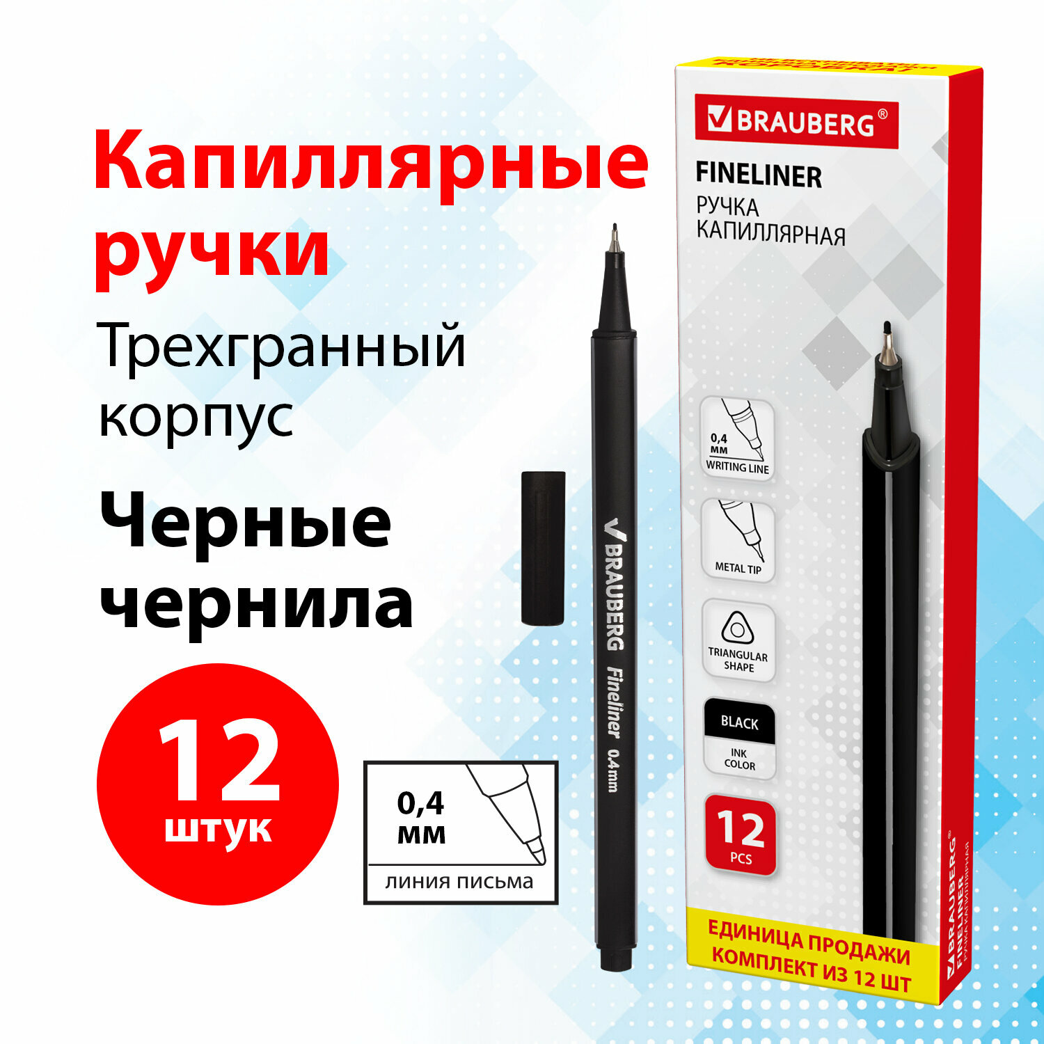 Ручка капиллярная (линер) черная BRAUBERG Aero, комплект 12 штук, трехгранная, 0,4 мм, 880466
