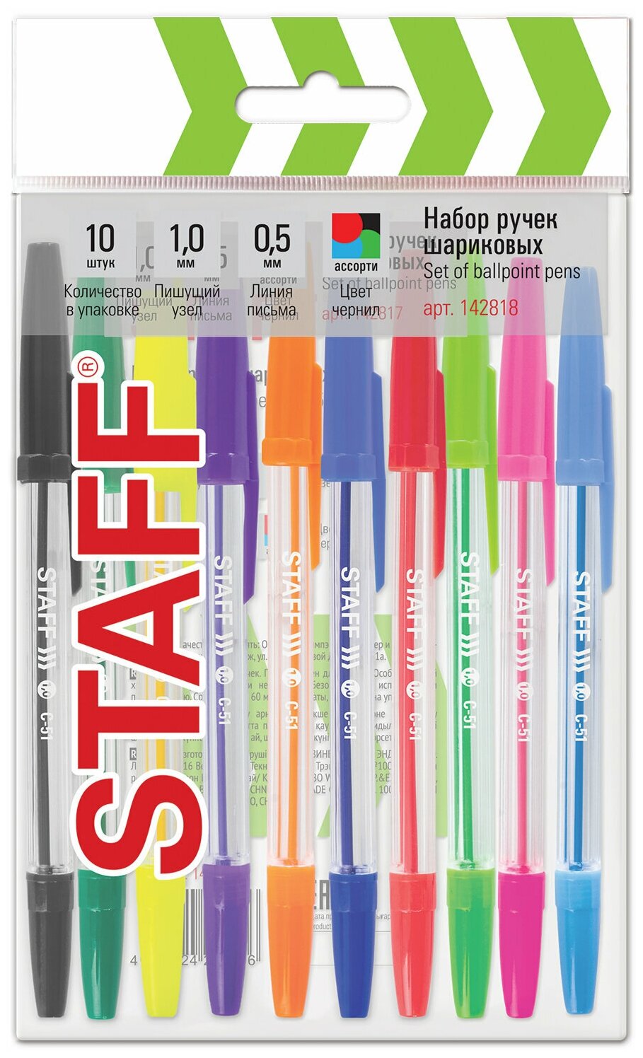 Ручки шариковые STAFF "C-51", набор 10 шт, ассорти, узел 1 мм, линия письма 0,5 мм, 142818.