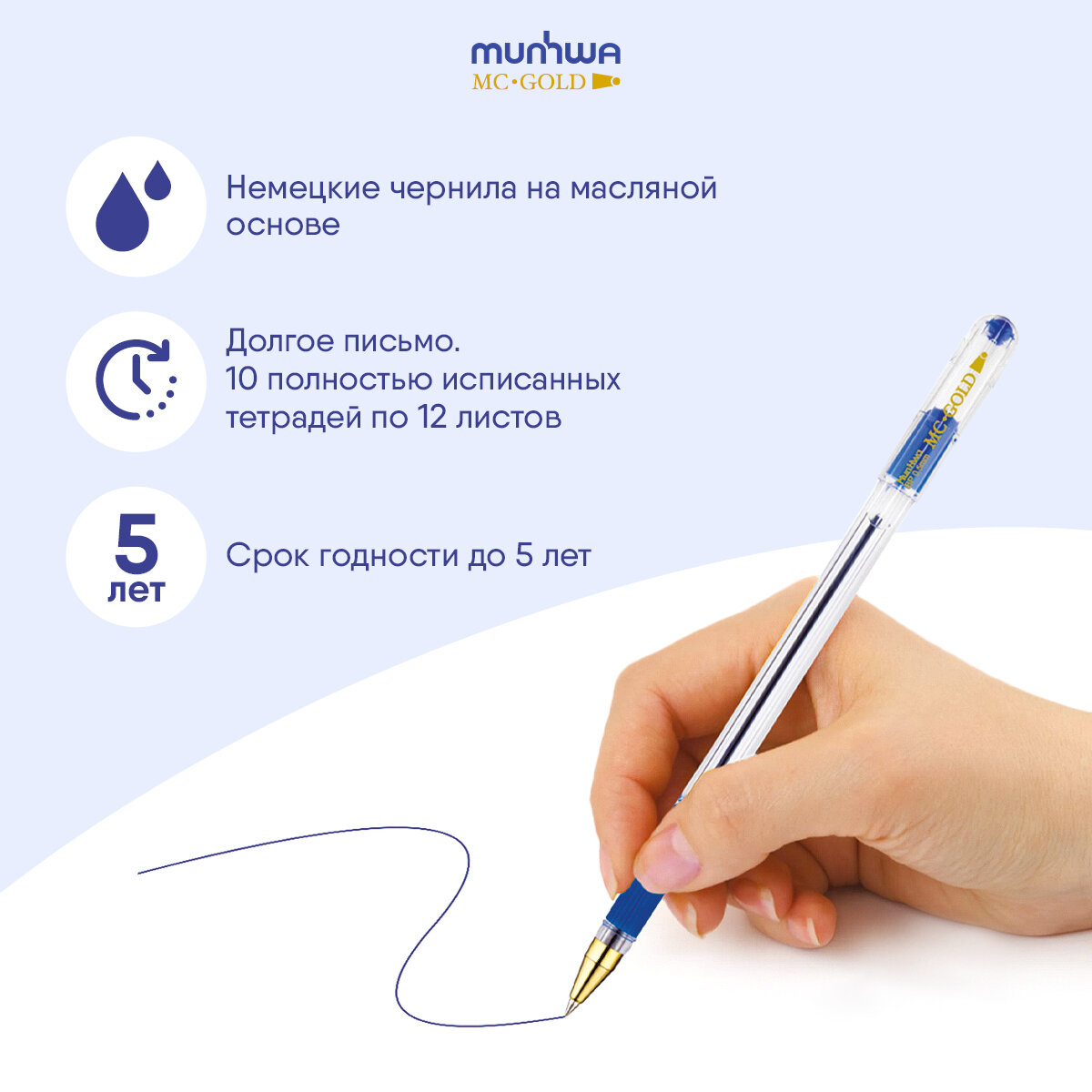 Купить Ручки шариковые синие набор для школы 12 штук/ выгодный комплект MunHwa "MC Gold" с тонким стержнем, масляные чернила, линия письма 0,5 мм, /канцелярия для офиса