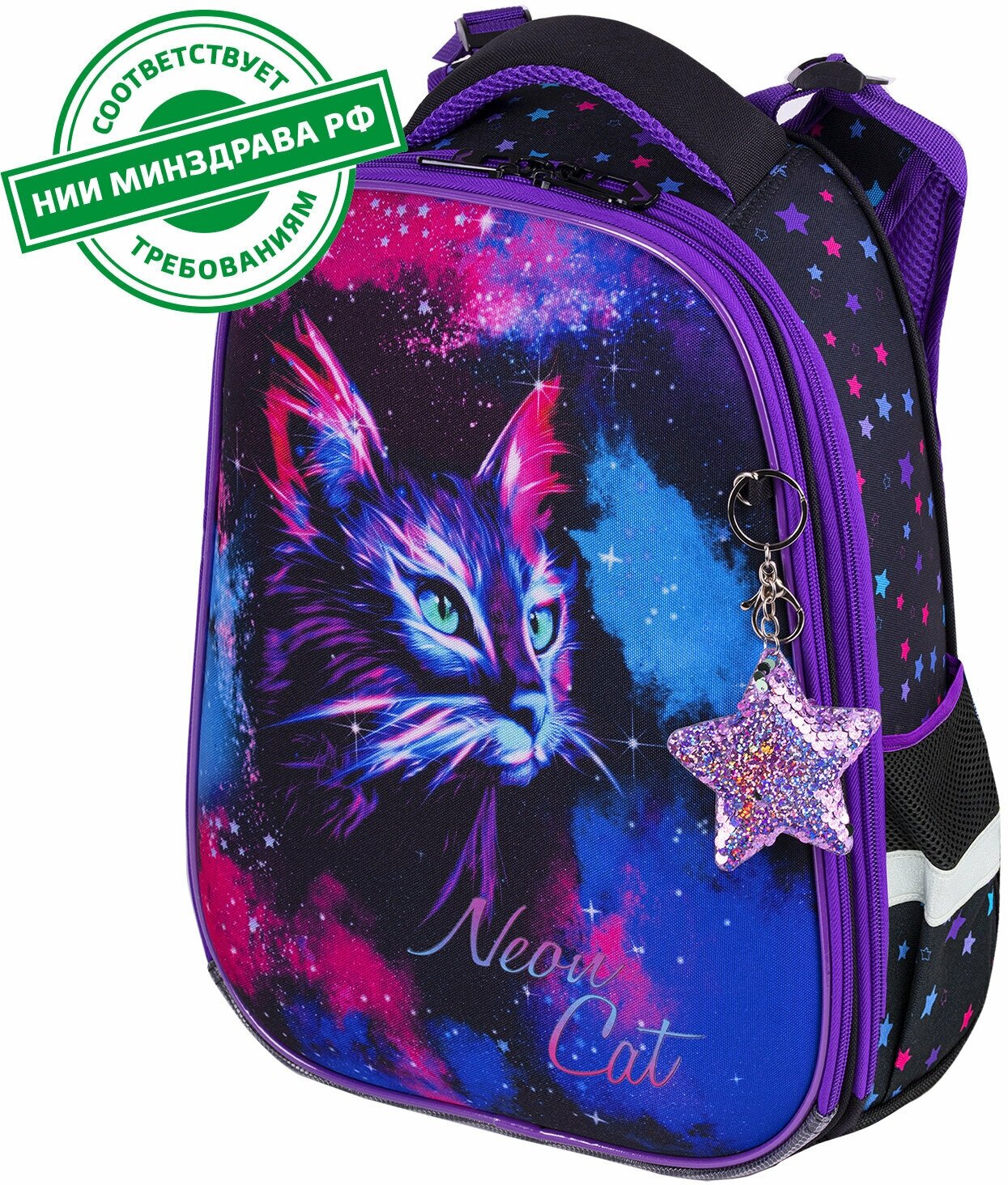 Ранец BRAUBERG PREMIUM, 2 отделения, с брелком, "Neon cat", 38х29х16 см, 271352