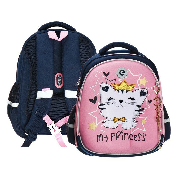 Купить Ранец каркасный, 36 х 28 х 20 см, Grizzly, из плюша, + брелок, тёмно-синий/розовый